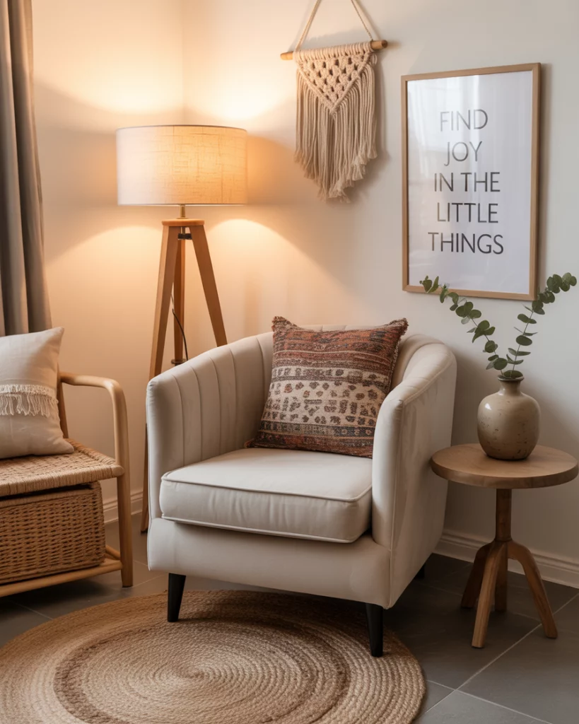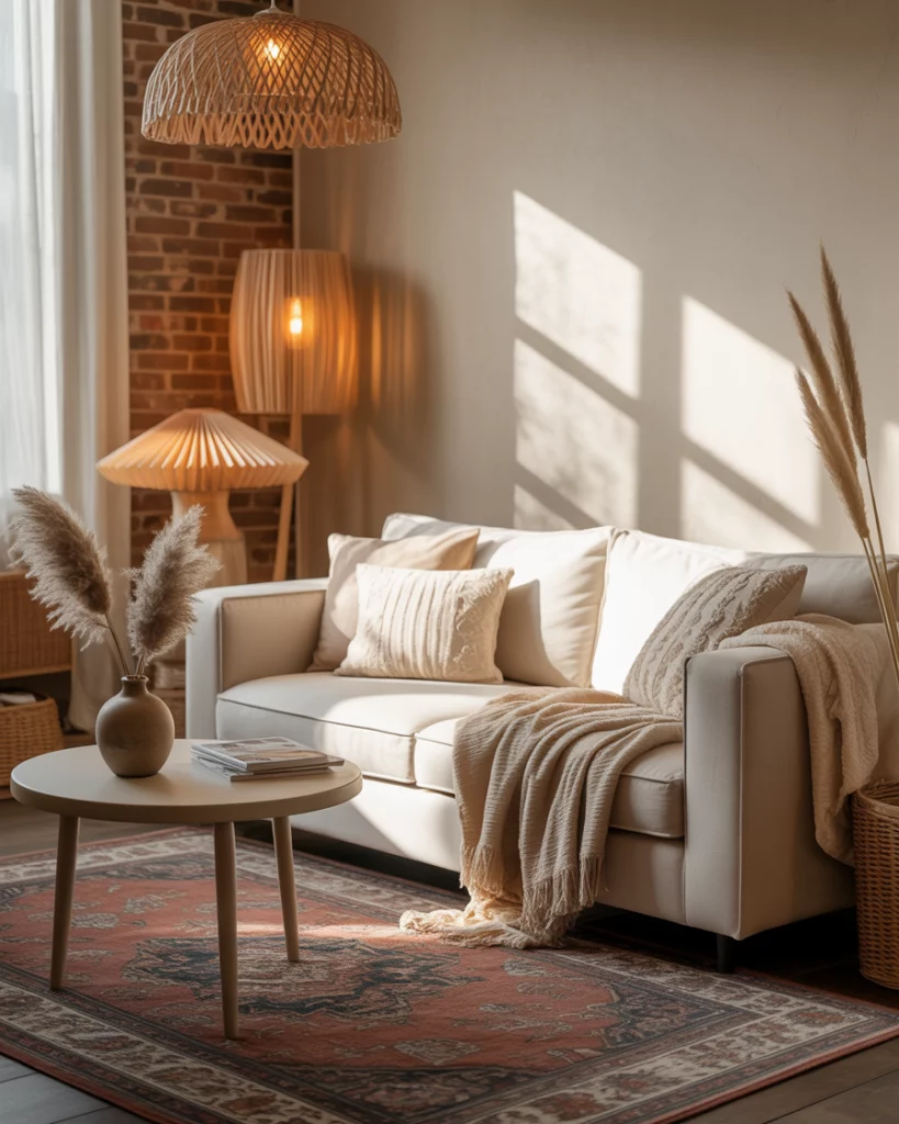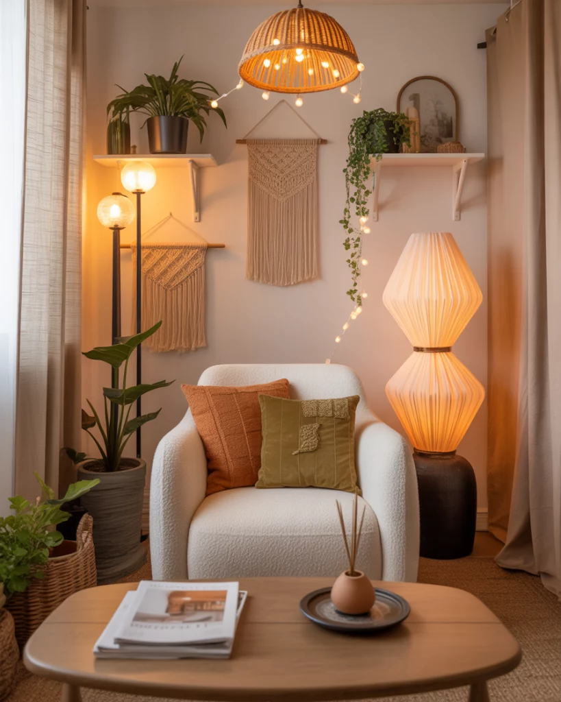 Lighting transforms a room faster than paint. In an Apartment cozy boho chic setup, layer string lights, lanterns, and warm table lamps. When I added a dimmable salt lamp near my sofa, guests immediately described it as “extremely relaxing.” The boho chic aesthetic mixes mood lighting with texture—macramé lampshades or cane details—to amplify that calm cozy vibe.