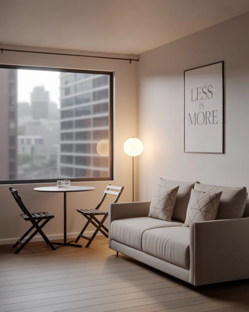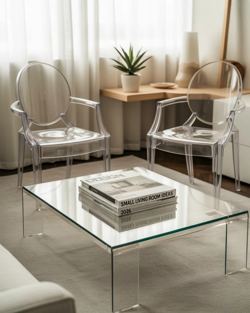 Acrylic or glass tables and chairs execute an almost miniature-house design trick of minimalism: see-through furniture just doesn’t read as a “mass” in a very condensed room. I remember visiting a blogger’s Apartment cozy boho chic studio where a clear coffee table blended right into the background. That allowed her patterned rug and textiles to take center stage. Pair this with a low-profile sofa to keep that visual weight minimally present.