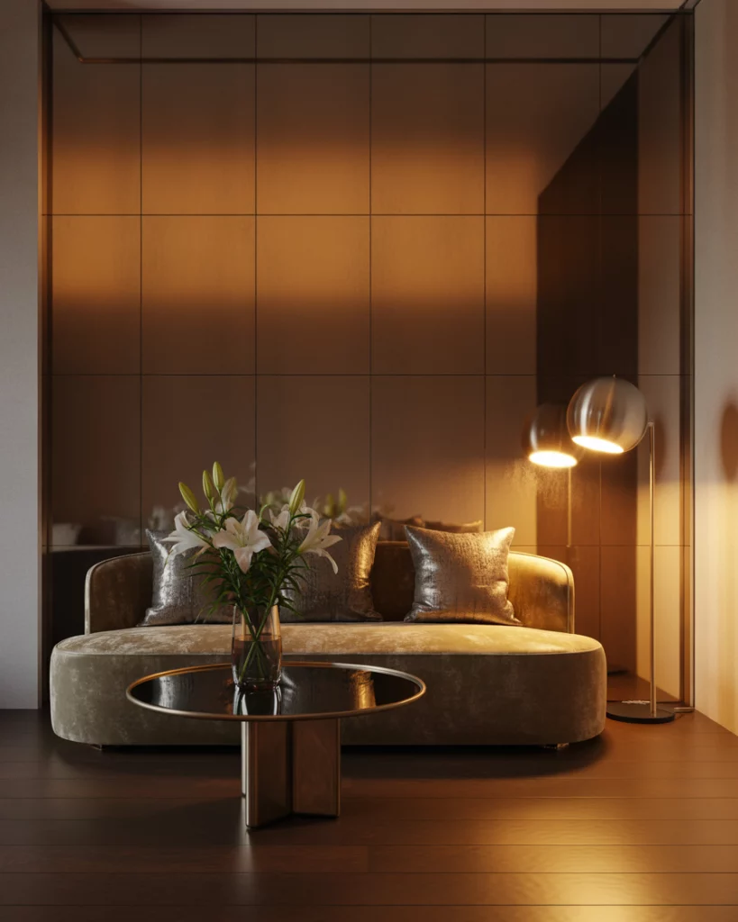 An elegant mirrored wall is an old decorator’s trick for small spaces—it doubles light and square footage visually. I once installed a floor-to-ceiling mirror behind a slim console in my apartment, and guests swore the room had grown. Combine this with subtle sconces for that boutique-hotel cozy atmosphere. Works beautifully in both modern and Scandinavian interiors.