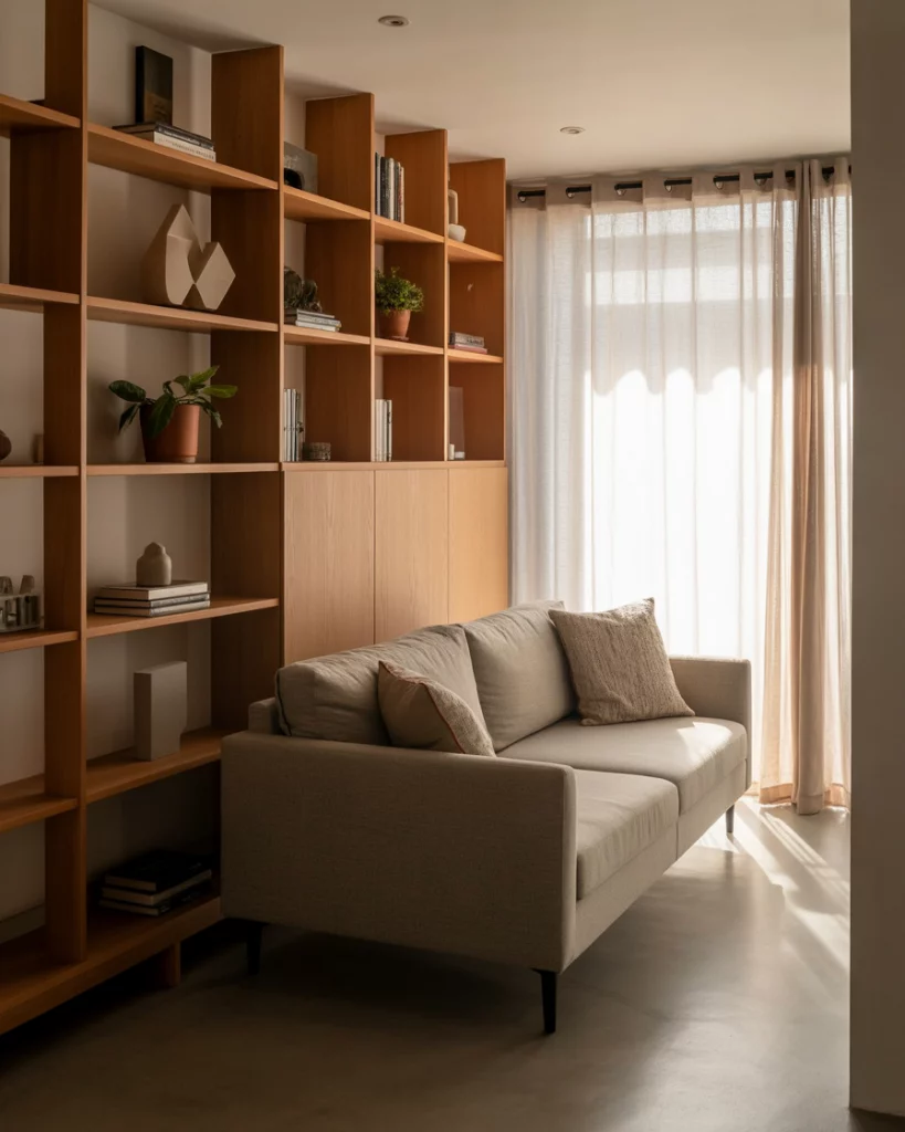 A slim open shelving divider lets you define space in an Apartment modern layout without closing it off. You can separate a lounge from a dining area or workspace while still keeping daylight free-flowing. I used a metal-and-wood frame once—it held plants, books, and baskets but still looked airy. Ideal for renters who can’t build walls yet want a very cozy segmentation.