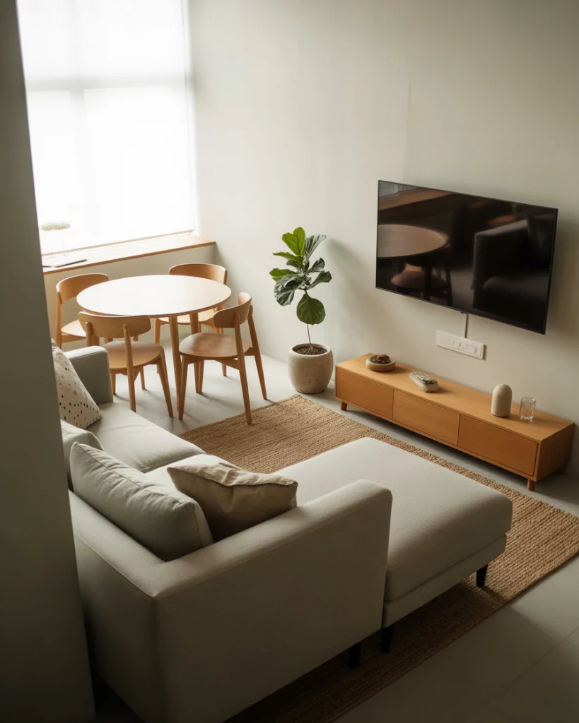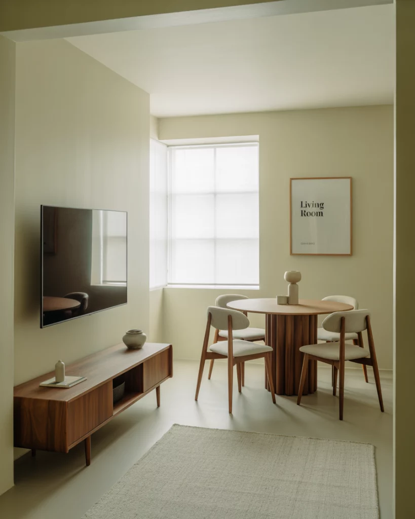 A Scandinavian approach keeps a layout with tv and dining table clean, symmetrical, and inviting. Pale wood tones, soft textiles, and plenty of daylight make even compact living rooms feel expansive. In one apartment modern remodel, I placed the tv opposite a slim dining bench to create flow without obstruction. The look is elegant, calm, and perfect for people who love order and simplicity.