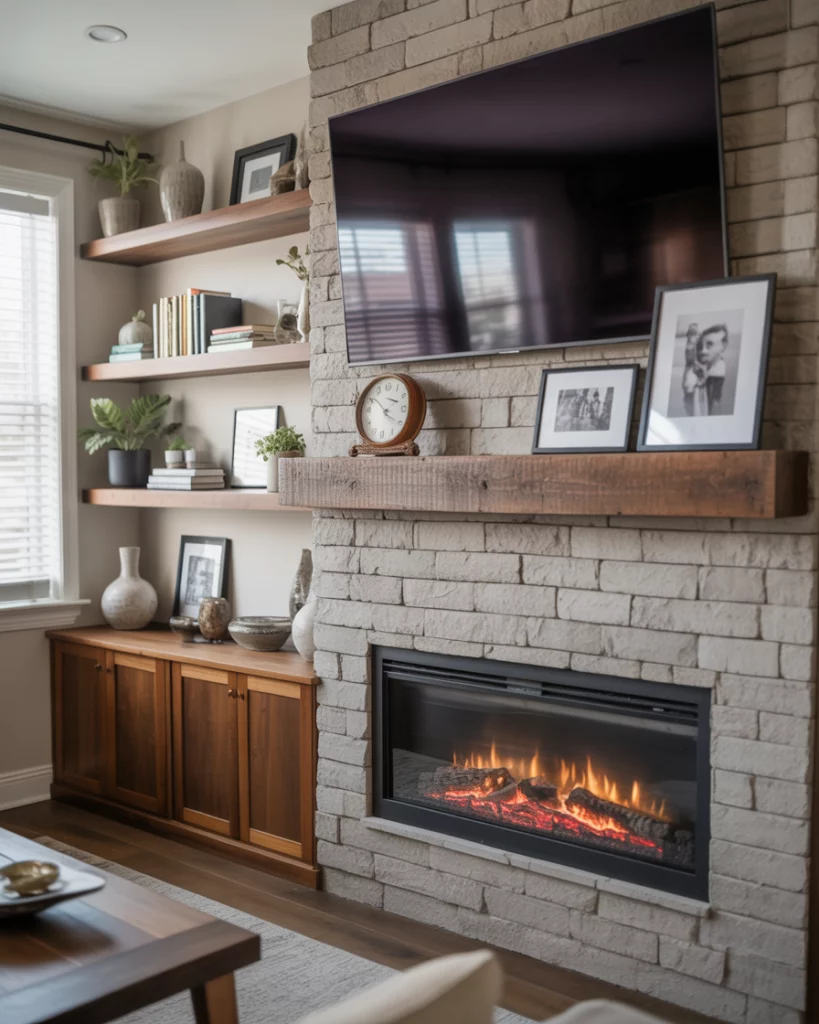 A built-in or faux fireplace wall with floating shelves gives you vertical interest and storage without eating floor space. Paint the wall a contrasting hue and anchor the fireplace at eye level. Shelves above can hold books, plants, or decor, drawing eyes upward and making the room feel taller. In one of my rental flats, I installed a slim electric firebox and flanked it with staggered shelves—I felt like I had a cozy lounge in a shoebox. Choose finishes that echo your rustic, Scandinavian, or elegant leanings.
