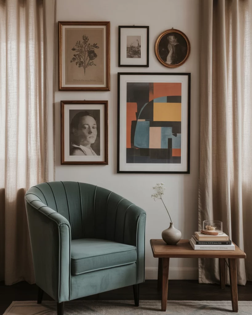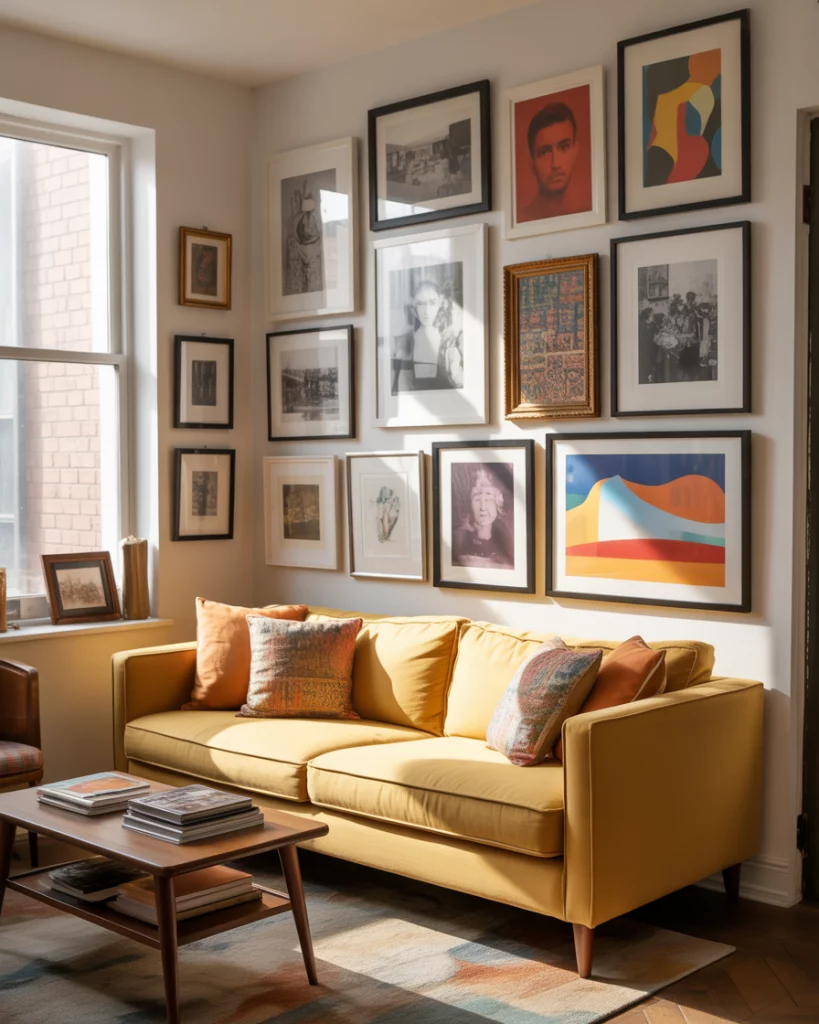 An eclectic gallery wall of small frames, mirrors, or decorative plates turns plain vertical surfaces into visual focal points. In a small room you don’t have floor space to spare, so let the walls do the talking. At my first apartment I curated photos, vintage postcards, and botanical sketches into mismatched frames—I’d always get compliments from guests. Mix line art, small paintings, your own prints. Keep the layout dense but balanced, and paint the frames the same color for cohesion.