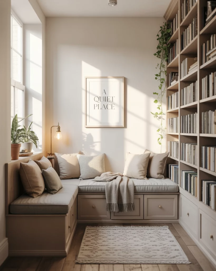 A built-in bench under a window or corner, topped with cushions, becomes a cozy reading nook and extra seating. For one project, I designed an L-shaped bench with storage beneath, then added a wall sconce and small shelf above. It instantly felt like a quiet getaway inside the larger living room. Use neutral upholstery or a bold textile to make it stand out. This works in Apartment cozy aesthetic schemes or rustic loft looks alike.