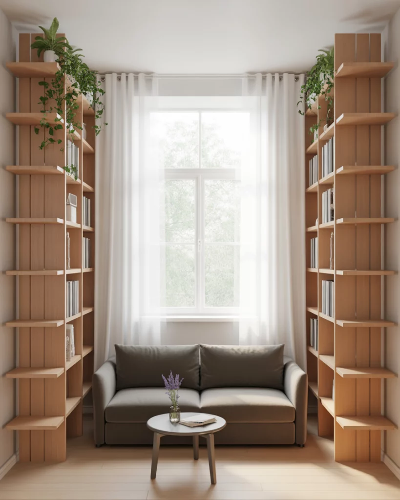 When ceiling height allows, go super tall with vertical storage or even a slim mezzanine shelf. Think ladders to shelves or a low loft for storage or plants. In a cozy tiny house I once visited, the owner built a platform for books above the seating zone—it felt like an airy mezzanine in a 12-foot ceiling living room. Use slim ladders, wire baskets, and lightweight shelving so it doesn’t feel heavy. This approach suits minimalist or rustic sensibilities.