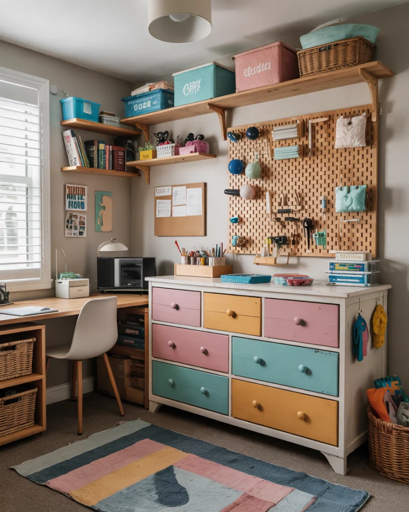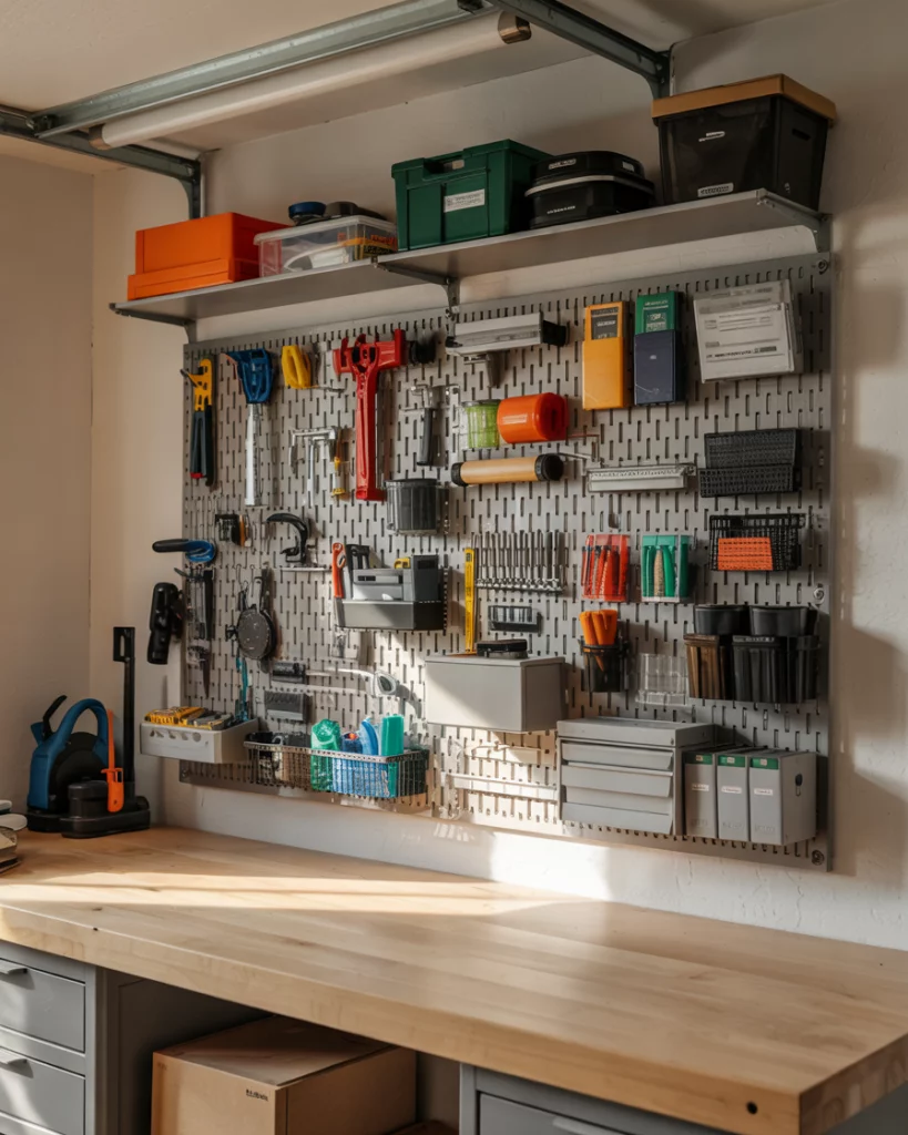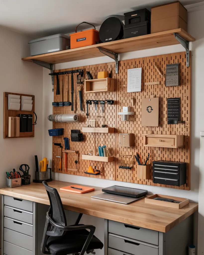 A pegboard wall is the 2026 must-have solution for any garage, office, or hobby area. Use the pegboard wall to hang your tools, your craft supplies, or your stationery. This unique and creative organizational solution keeps everything visible and accessible.