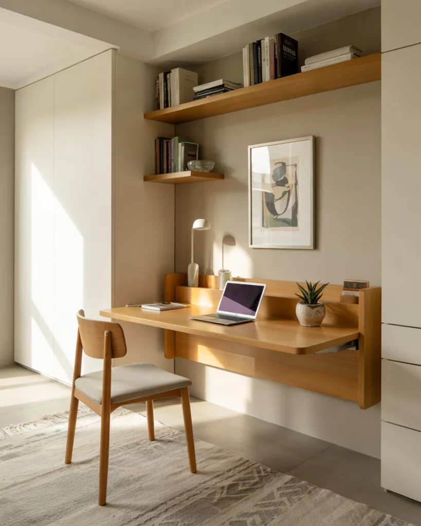For a room used in multiple ways like the living room in compact apartments, the best solution for additional office space would be to build a fold-out desk that can fit against the wall. Stacking shelves can store files and other office equipment. This innovative solution can also work as a desk area and relaxation area.