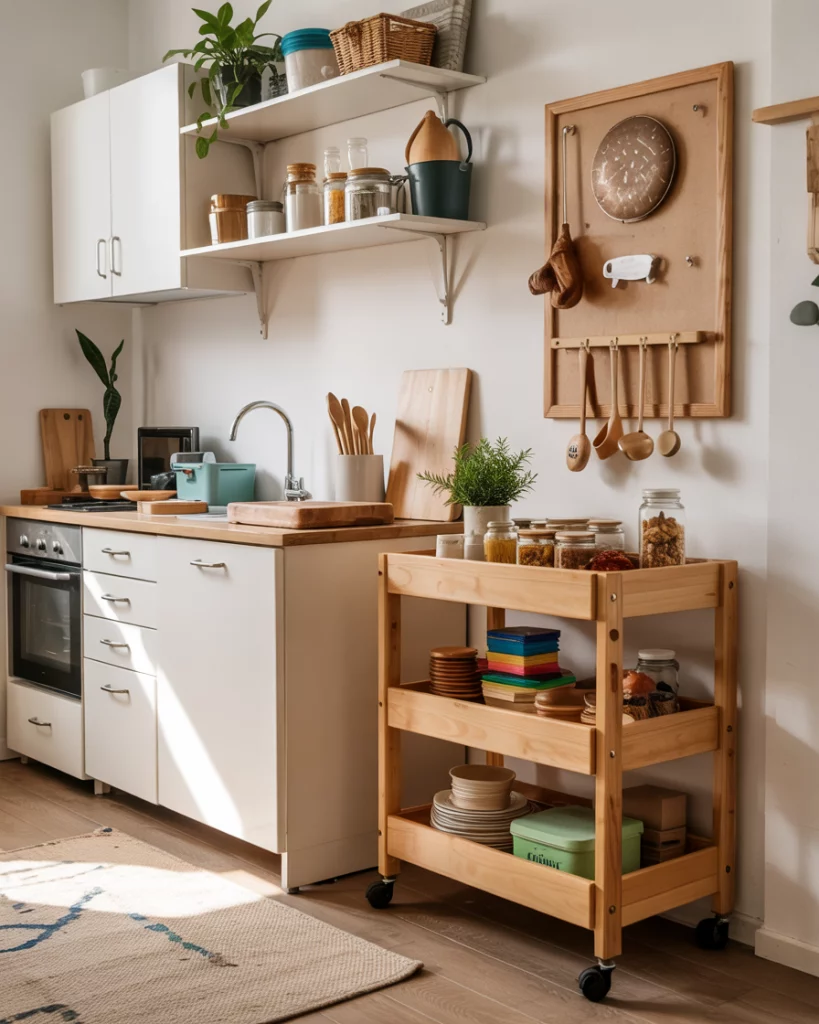Another innovative solution in compact apartment designs can come from the creation of rolling shelves. In kitchens, the shelf can store food items. In the art room, the shelf can store materials. In the kids’ room, the shelf can store their playthings. They can add more functionality to a room at very little cost.