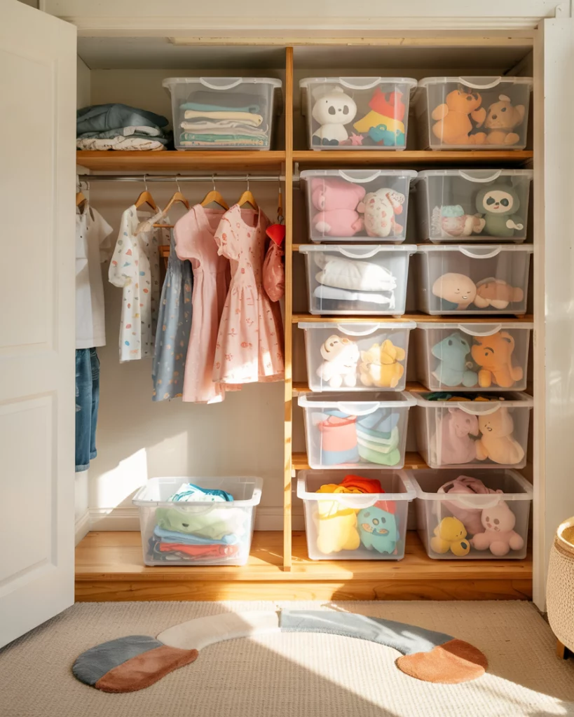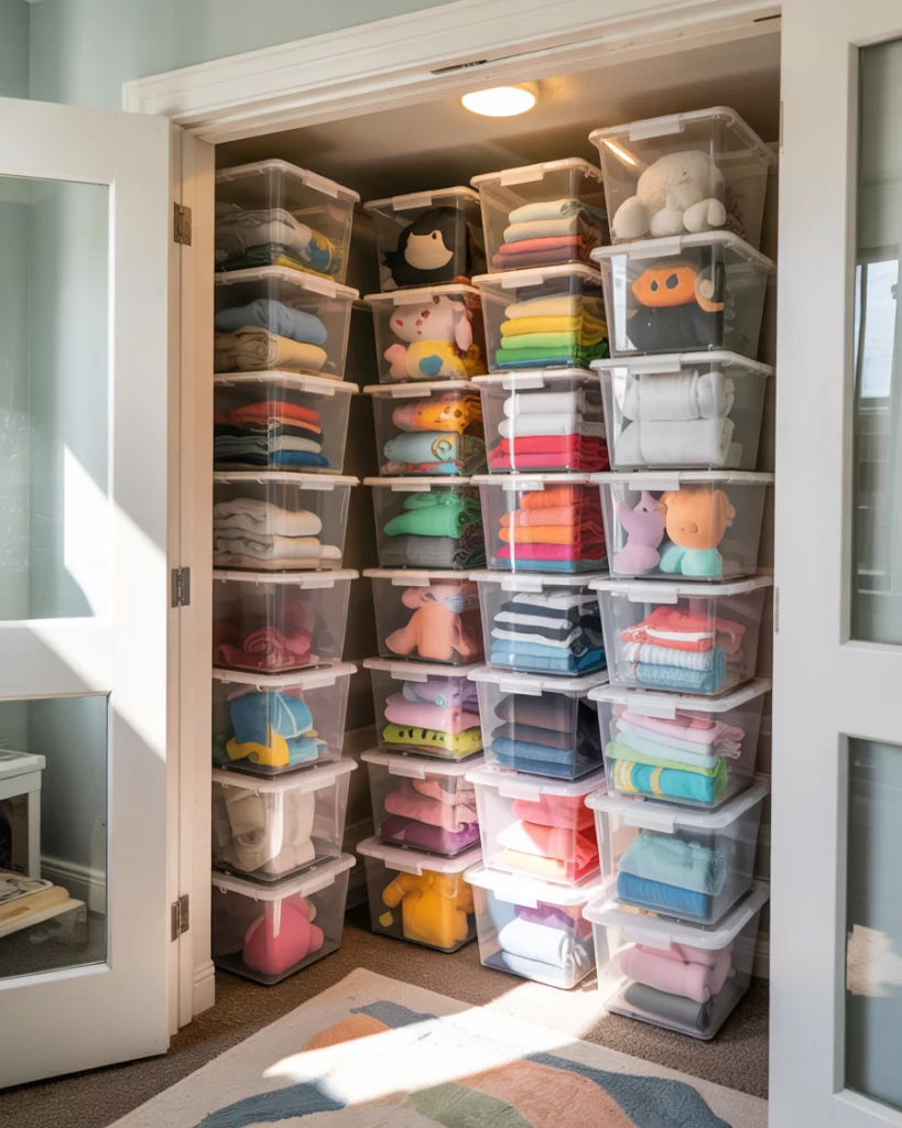 Stackable transparent bins are perfect for organizing clothes, fabrics, or toy collections in any closet or kids’ room. See the contents at a glance—you won’t ever have to rummage through the bin again for that lost sweater or Lego piece. This great organizational solution costs little and offers great organizational utility.