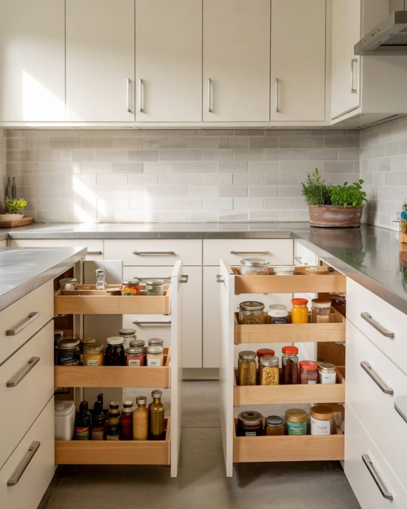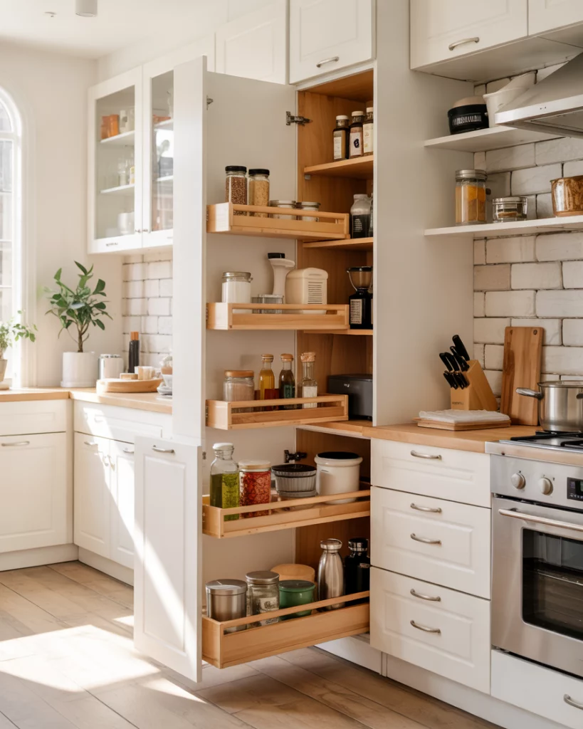 In the compact kitchen of 2026, everything must fit. Use the best available designs created specifically for the compact kitchen. Pull-out pantry drawers slide between the closed cabinets or fit between the closed doors of your kitchen. Even the best designs involve the perfect pantry drawer storage solution. This great organizational solution has the useful cost factor of being very easy and very cheap.