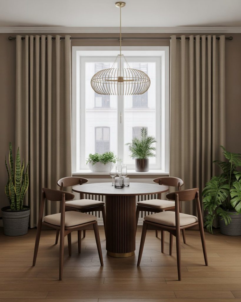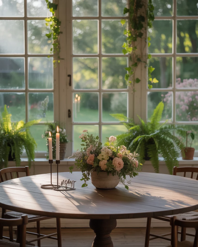 In place of a formal dining room, why not have meals in a cottage-style sunroom? This is an excellent entertainment table with a solid wood table, basic chairs and a lot of glass light. This environment fits farmhouse and French country homely houses and combines food and setting.