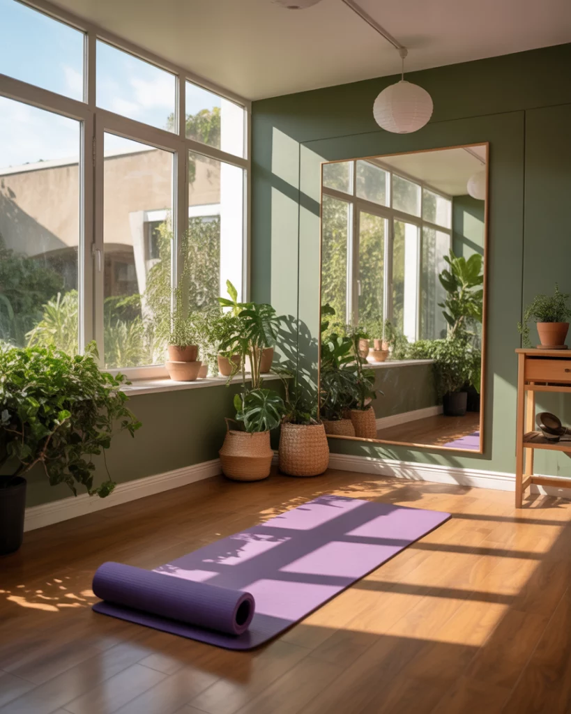 A sunroom may be also used as a personal gym, particularly yoga or light exercise room. With glass walls, natural light can enter the building and even small areas can become inspirational. Select exercise flooring that is slip-resistant, include a mirror and a bench/futon to stretch. this contemporary concept fits not only suburban houses, but also apartments, as fitness in the home can be beautiful and healthy in a sunroom, yoga mat and mirror and plants and light natural.