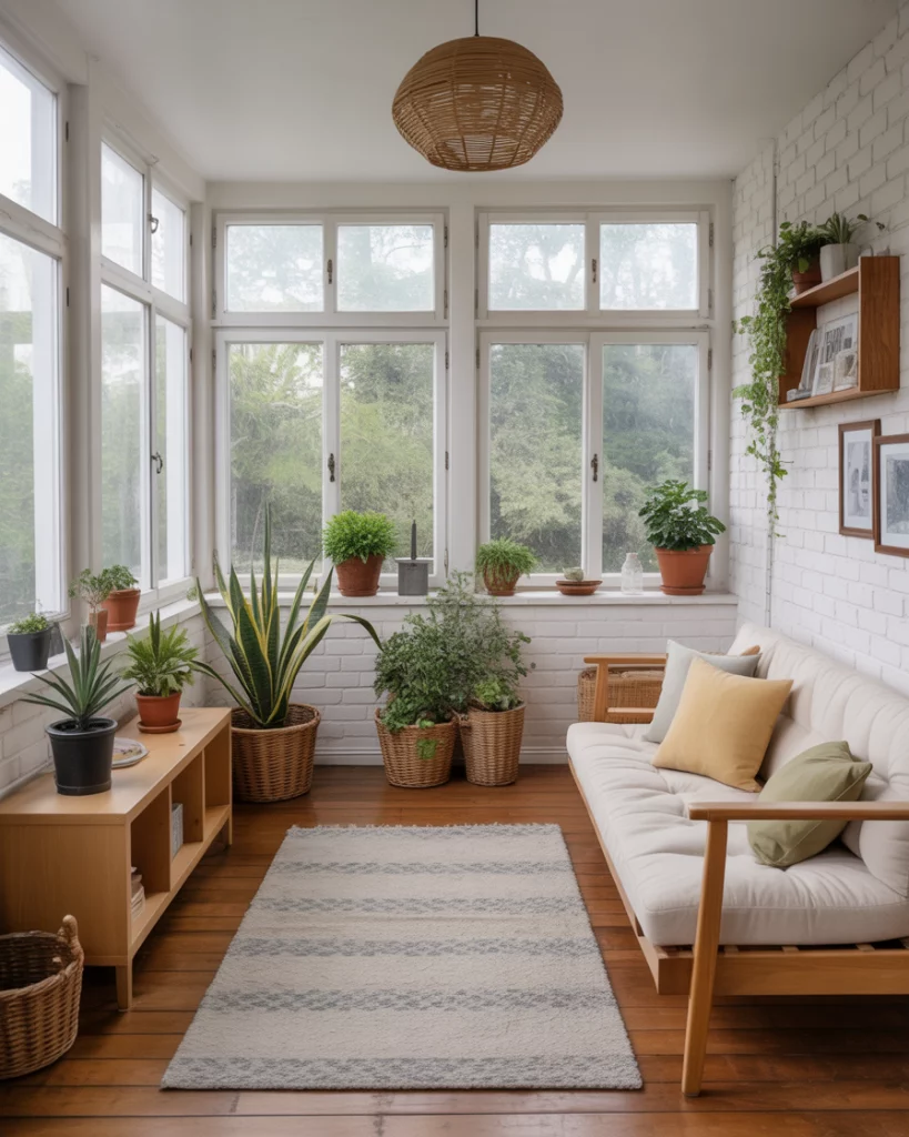 Another one of the most classic sunroom concepts is the idea of embracing the light. The light and airy interior begins with glass walls that erase the line between the inside and the outside. A large room in a small space, or a 10×10 area at best, this style creates the appearance of something far bigger. Add light-toned flooring for warmth, soft textiles, and a low-profile futon or bed for flexible lounging.