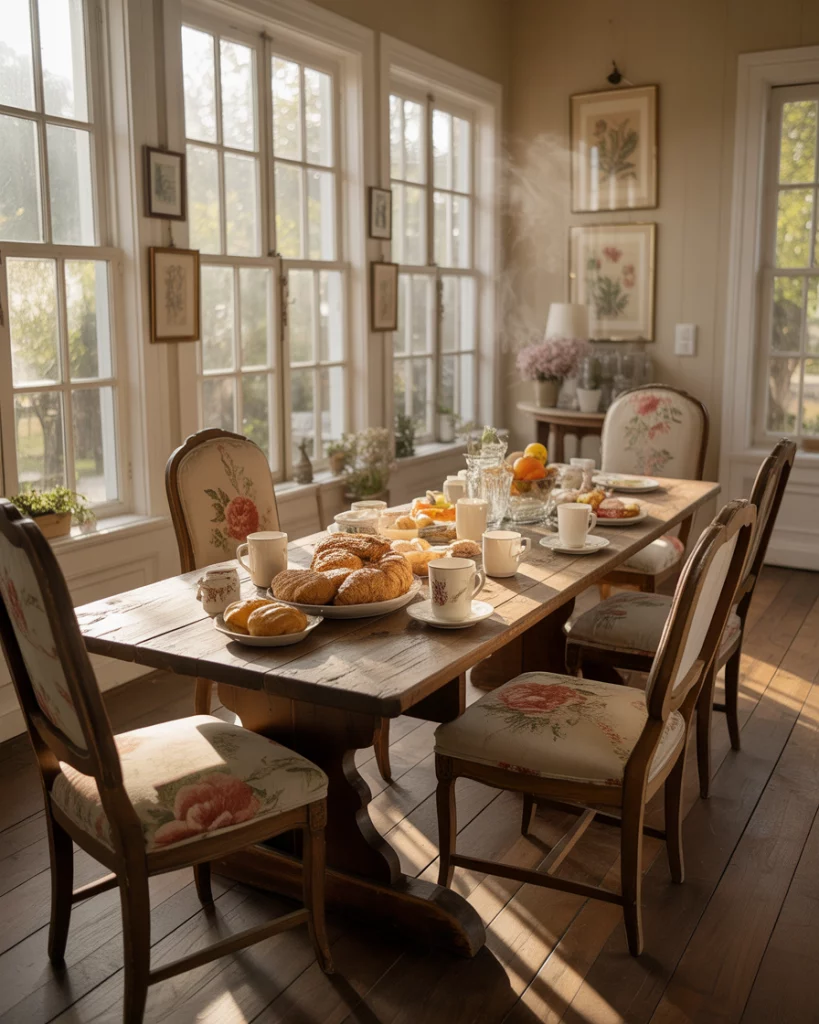 In place of a formal dining room, why not have meals in a cottage-style sunroom? This is an excellent entertainment table with a solid wood table, basic chairs and a lot of glass light. This environment fits farmhouse and French country homely houses and combines food and setting.