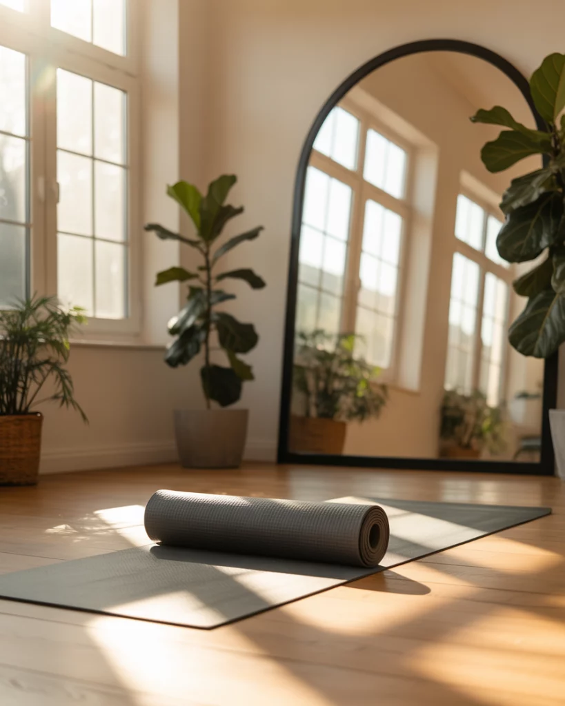 A sunroom may be also used as a personal gym, particularly yoga or light exercise room. With glass walls, natural light can enter the building and even small areas can become inspirational. Select exercise flooring that is slip-resistant, include a mirror and a bench/futon to stretch. this contemporary concept fits not only suburban houses, but also apartments, as fitness in the home can be beautiful and healthy in a sunroom, yoga mat and mirror and plants and light natural.
