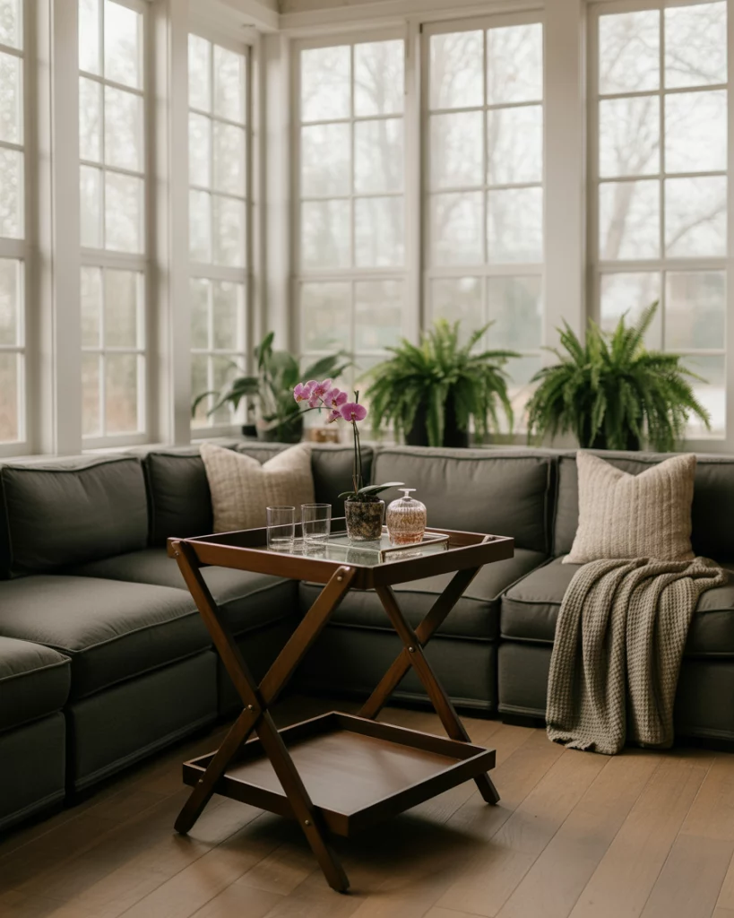 A sunroom can be transformed into a small-bar lounge, where people love turning it into an entertaining area. Use dark accents for sophistication or bright and airy tones for vibrancy. Include a slim bar cart, comfortable seating, and easily cleanable flooring.