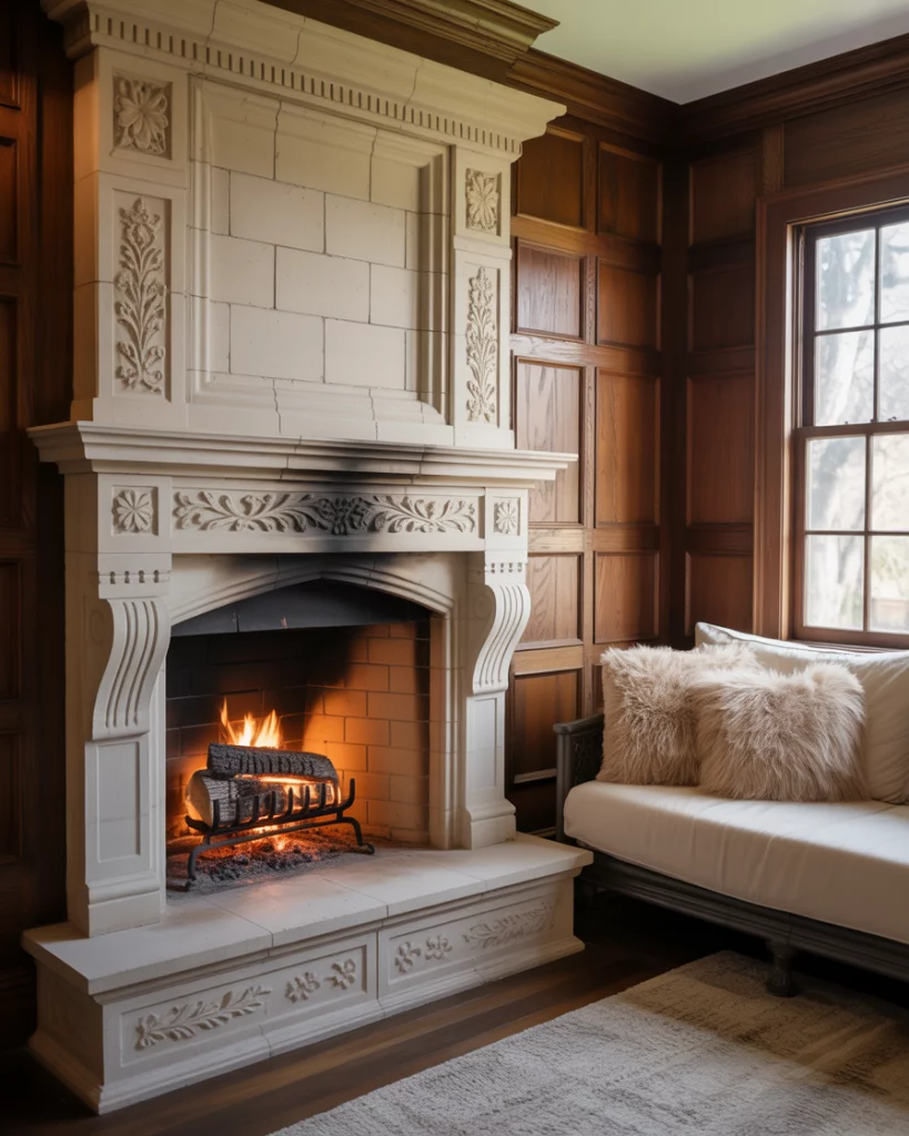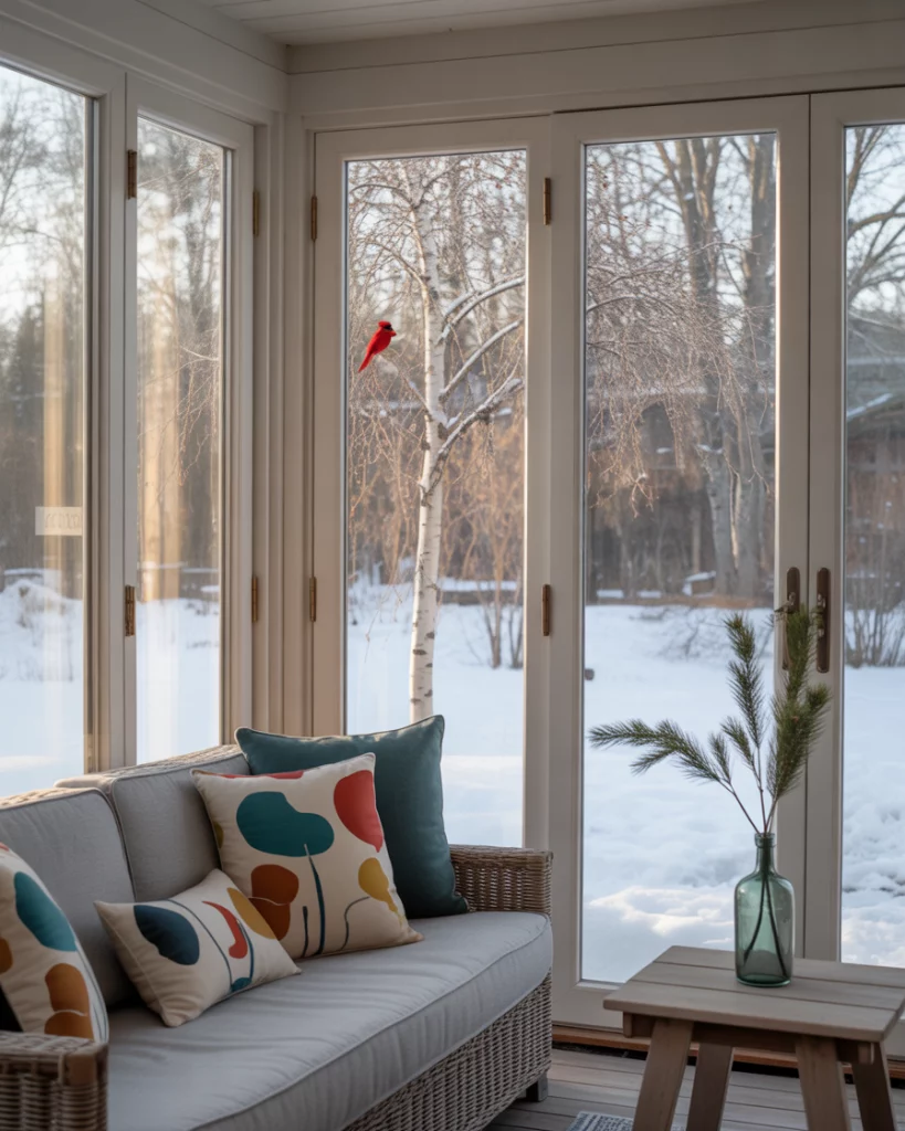 An atrium leads to a 4 season room with a fireplace. A gas or electric fireplace adds warmth and the space remains useful during winter evenings as well as summer mornings. This is especially effective in a farmhouse or cottage environment where comfort is central. Pair the fire with cozy throws, a low bed-like bench, or futon seating for a gathering spot.