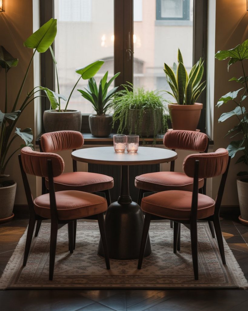Based on the classic breakfast nook, this version in a farmhouse style pays attention to the rustic appeal. Include a solid large wooden table, old fashioned seating, and possibly a fireplace element somewhere in the vicinity. Layer in plaid textiles, simple plants, and cozy accents.