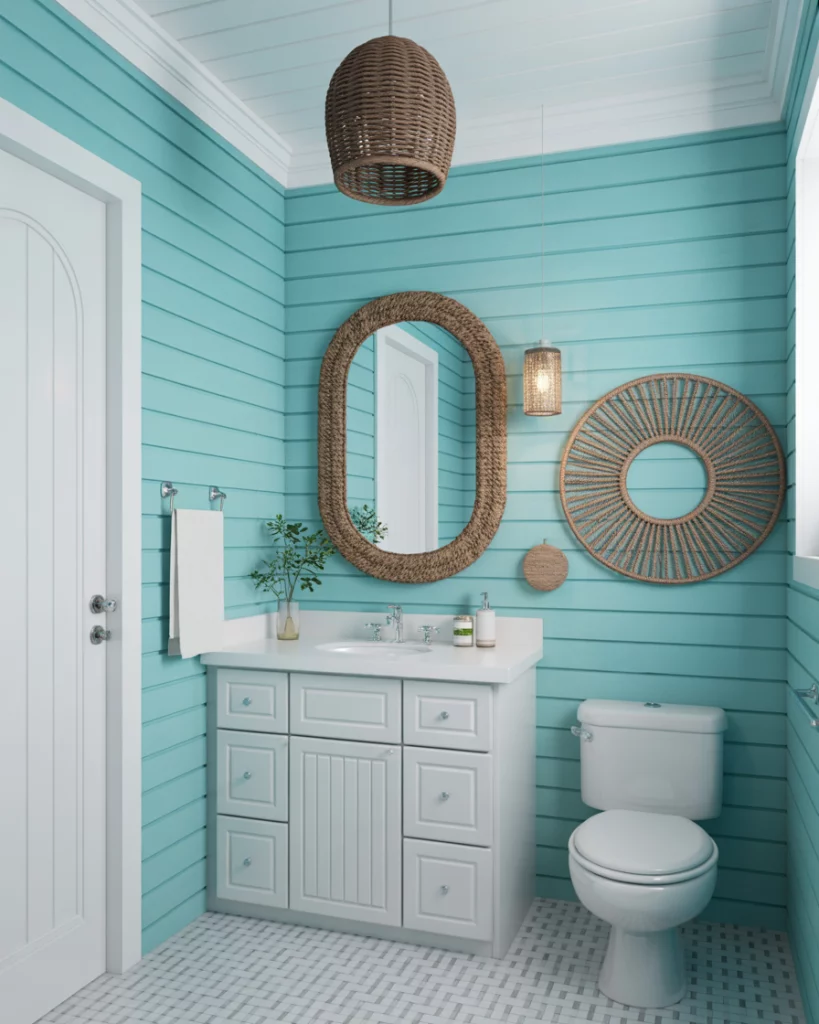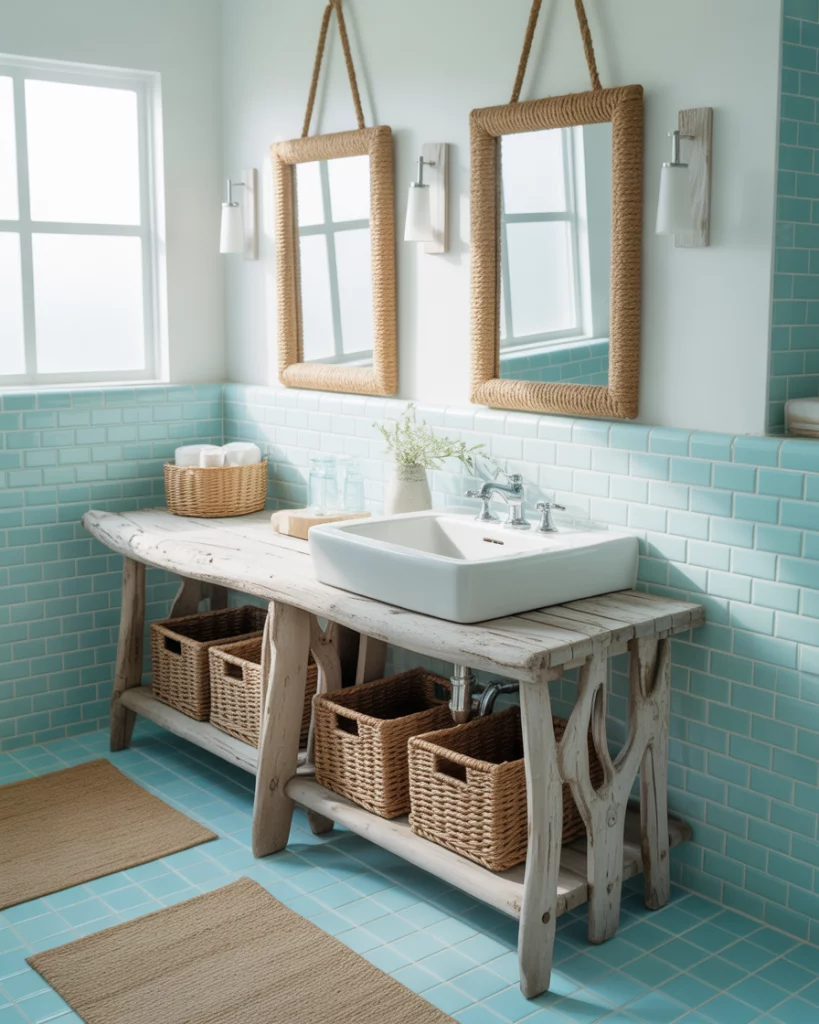 A soft blue palette instantly gives a guest bath a breezy, coastal feel. Pairing striped towels, woven decor, and a compact single sink helps even a tiny apartment space feel relaxing. I’ve noticed this trend rising on design blogs, where clean ocean hues make a modest shower-tub combo feel like a seaside retreat.