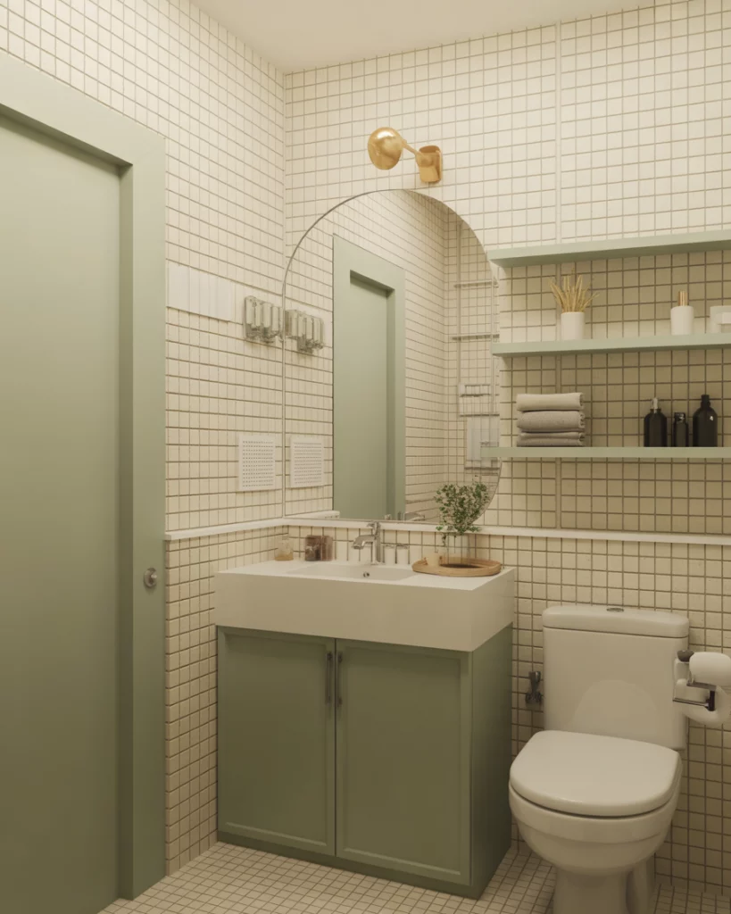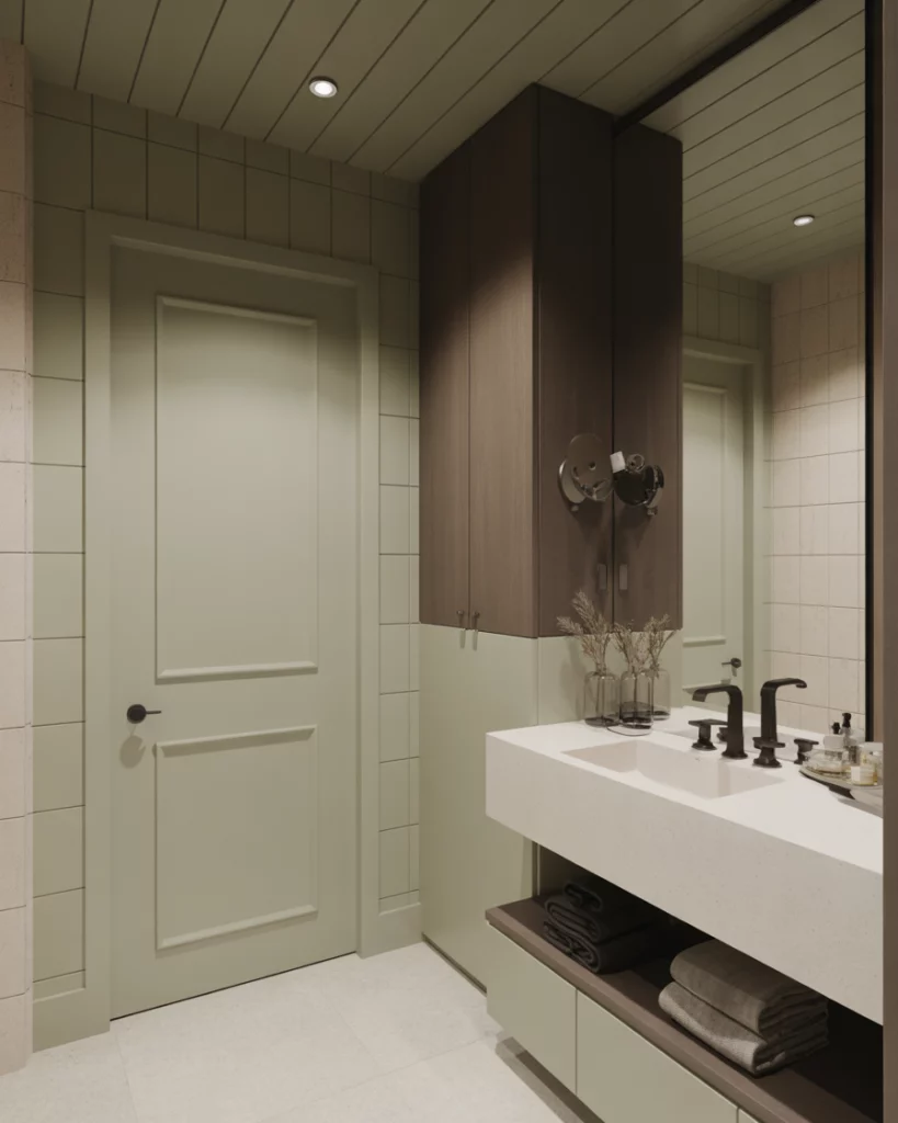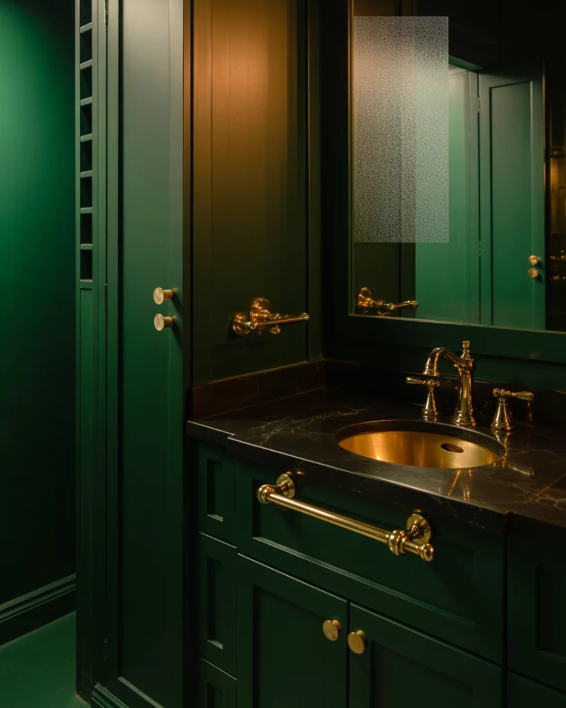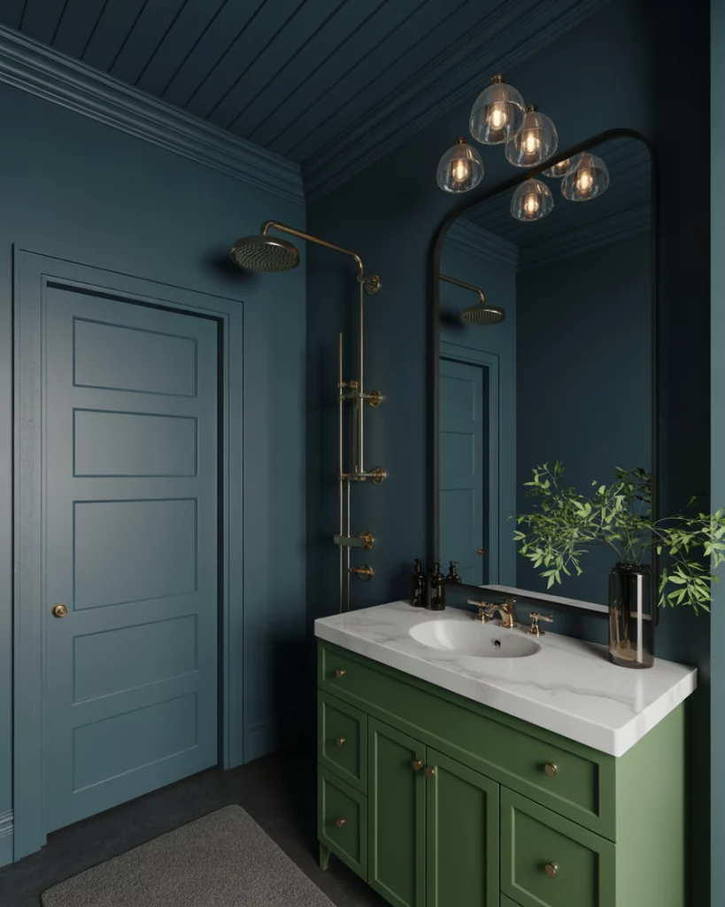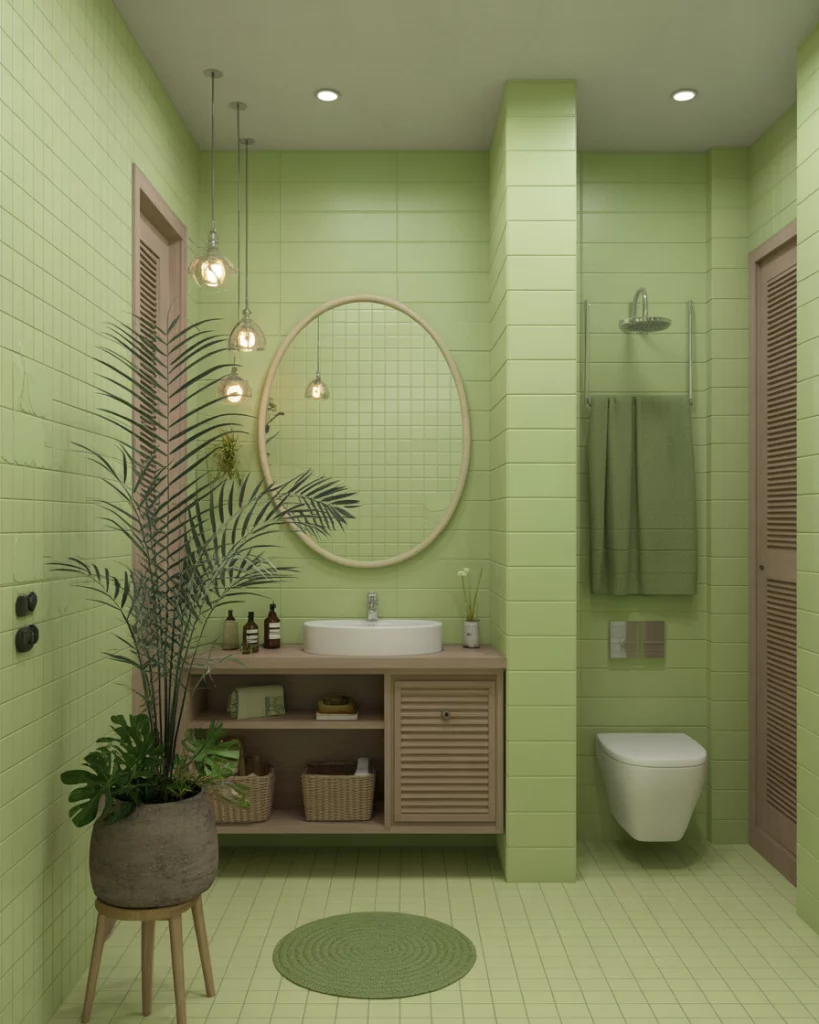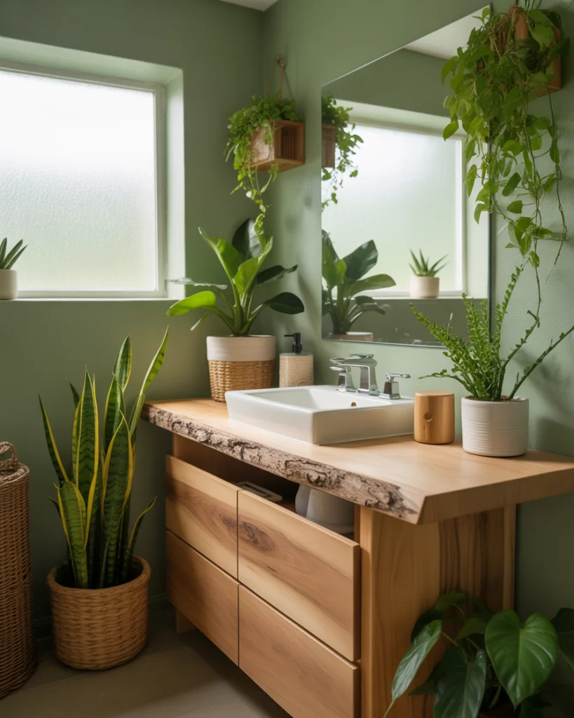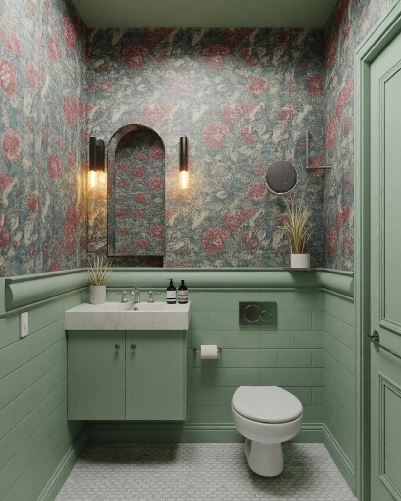 Deep green shades paired with leafy colors create a botanical mood guests rarely forget. Adding natural wood and warm brass gives this look a refined yet cute charm. A friend used this in her full guest bath, making the space feel both spa-like and grounded—perfect for plant lovers.