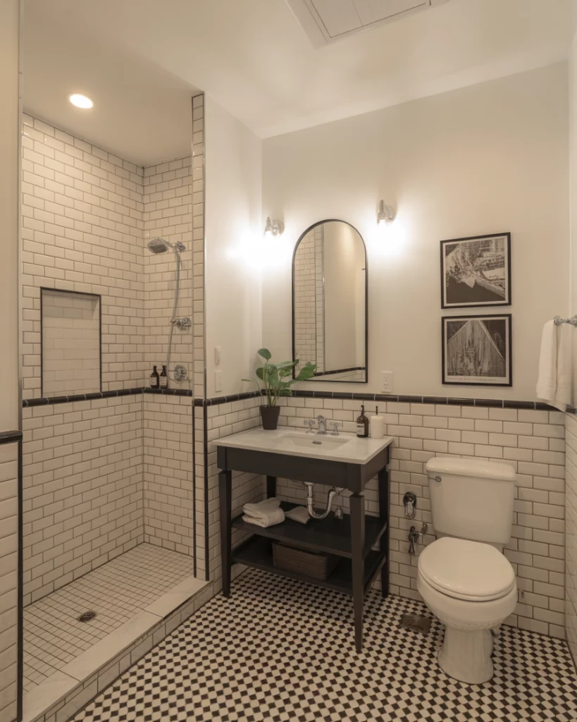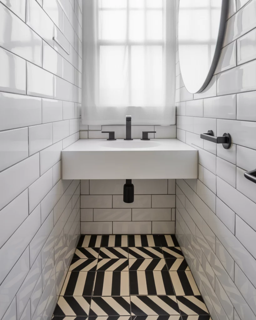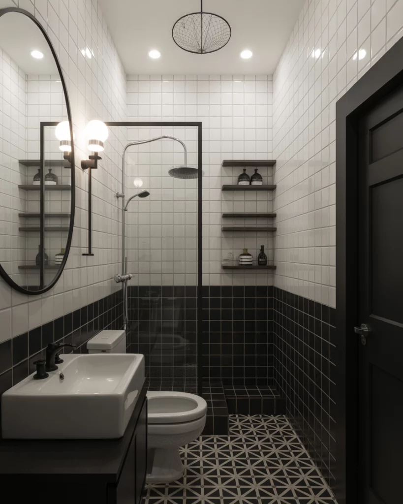 The classic black and white pairing becomes bold with geometric tile and streamlined fixtures. This style works perfectly in small modern spaces, especially when anchored by a sleek single-sink vanity. I’ve always admired how this look stays timeless while giving any apartment bathroom sharp character.