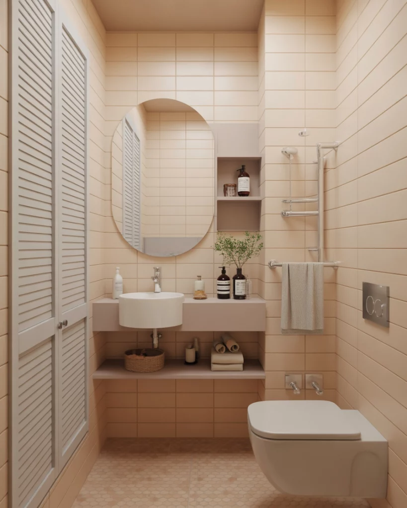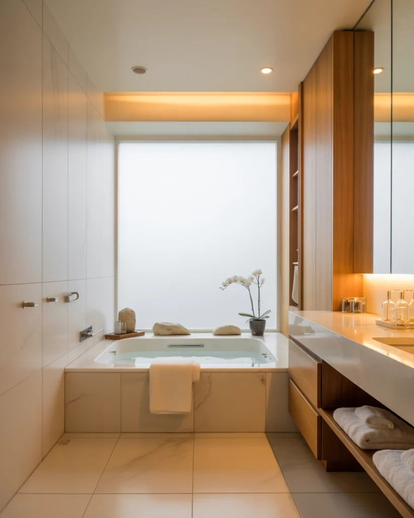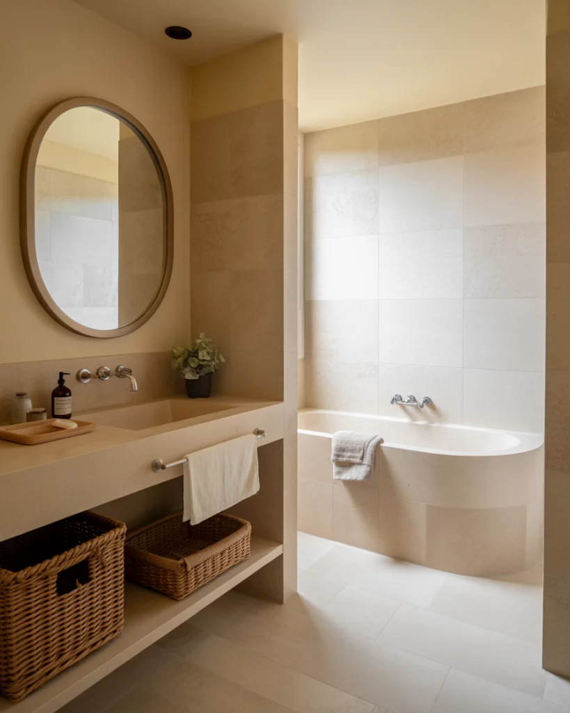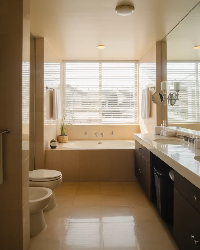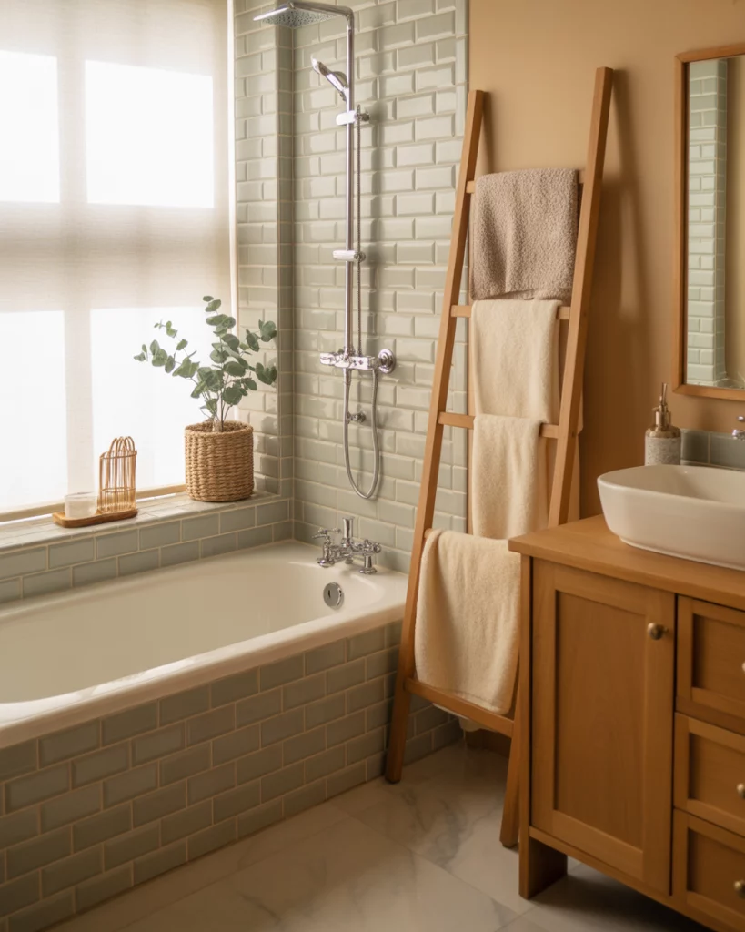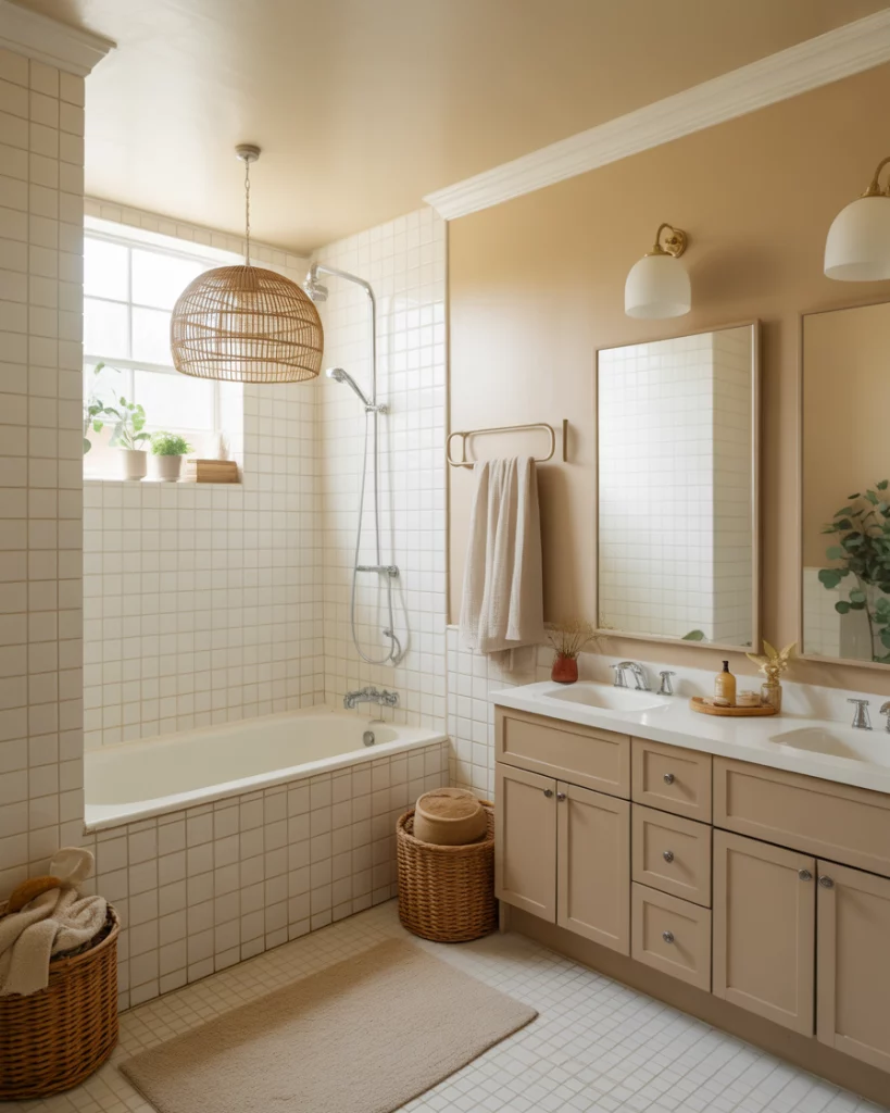 Soft neutral tones—tan, sand, and oat—bring calmness that guests instantly notice. Add smooth textures, stone-inspired finishes, and a petite tub layout for deeper comfort. I once saw this look in a rental home and couldn’t believe how serene a compact space could feel with such gentle colors.