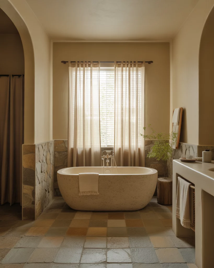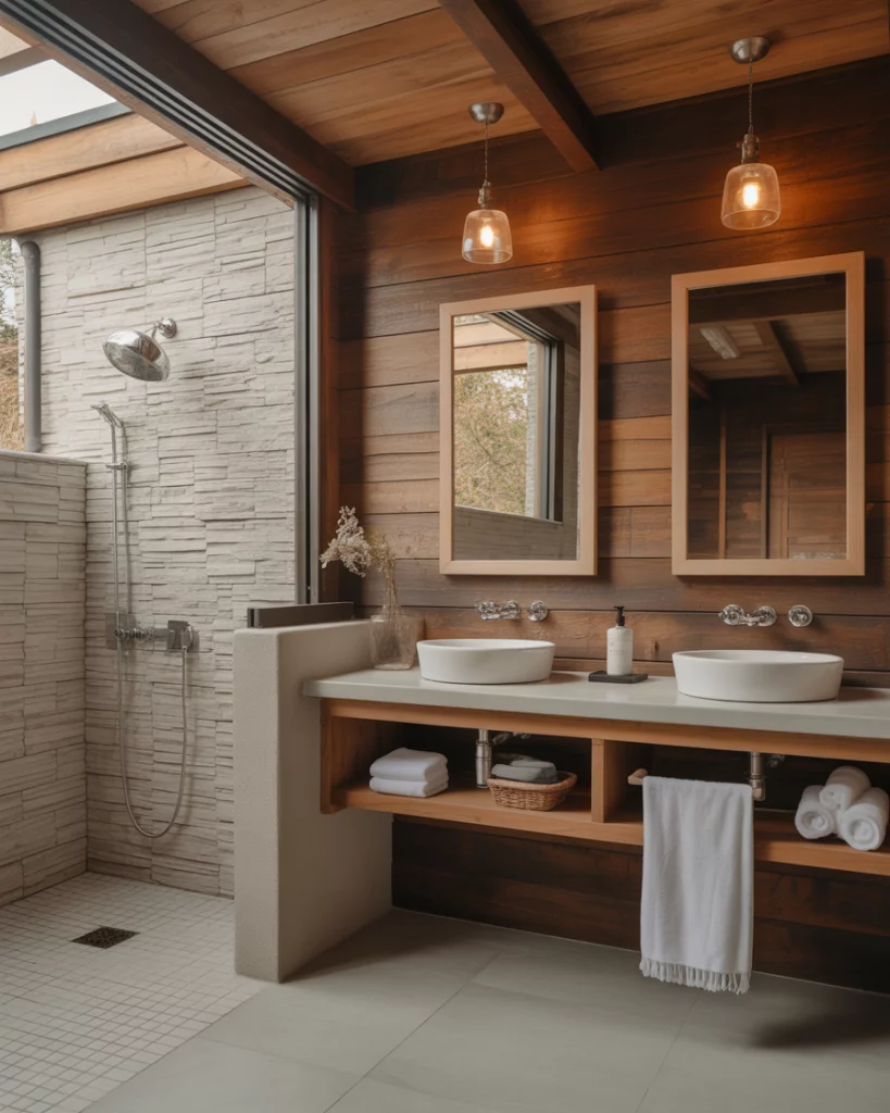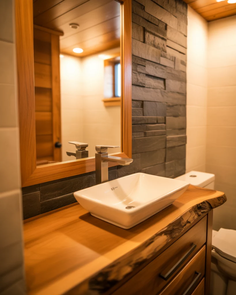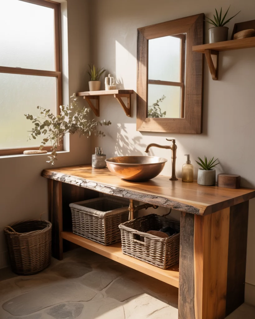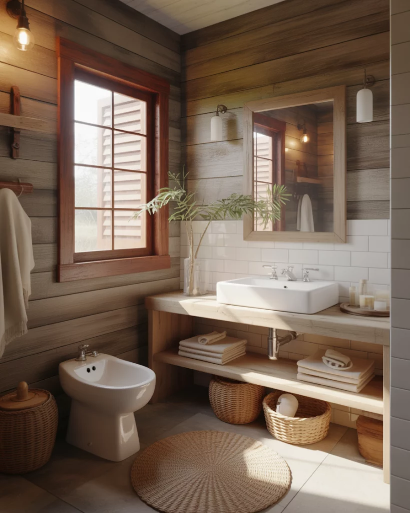 A rustic guest bath with wood textures, stone details, and layered decor invites a grounded, cabin-like peace. Even in city condos, this style adds warmth without sacrificing function. Natural colors and simple textiles keep the look approachable, never theme-heavy.