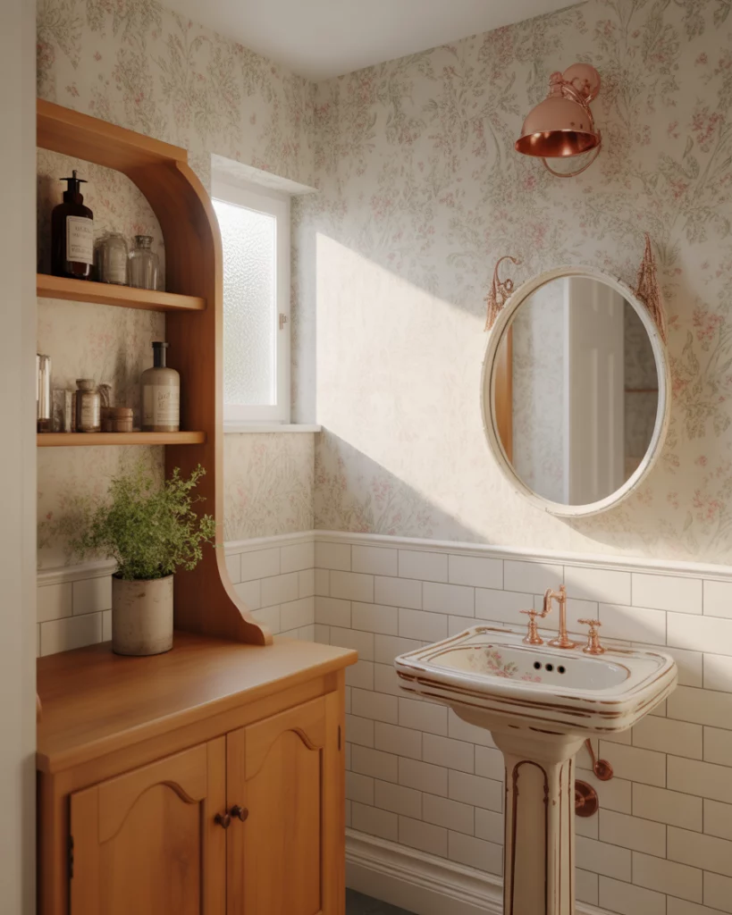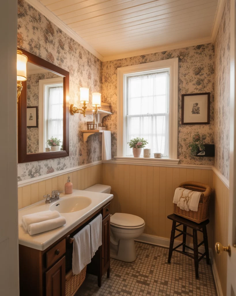 For a welcoming vibe, a cute cottage-inspired bath uses floral wallpaper, warm woods, and a single sink with vintage-style hardware. Even a tiny bath gains charm this way. This style reminds me of my aunt’s farmhouse guest bath—always cozy, always inviting.