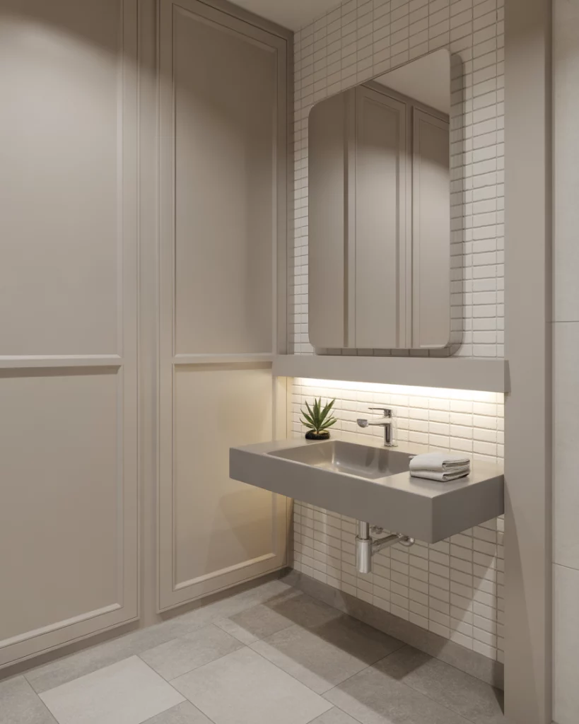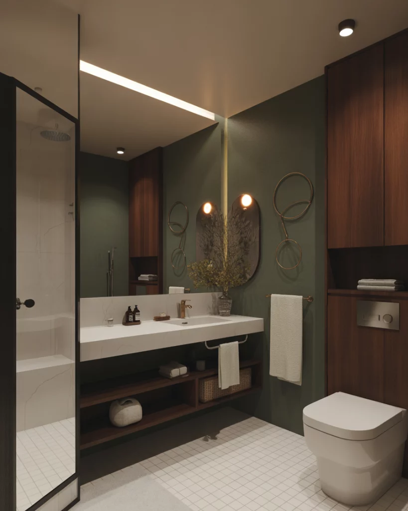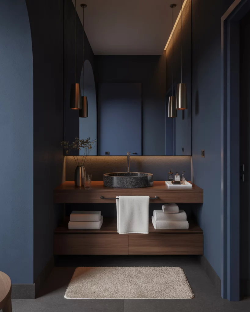 A blend of moody tones and soft spa textures creates a sophisticated yet comforting guest retreat. This style works beautifully in small modern or apartment baths with thoughtful lighting. I once saw a charcoal-painted guest bath that instantly felt like a boutique hotel.