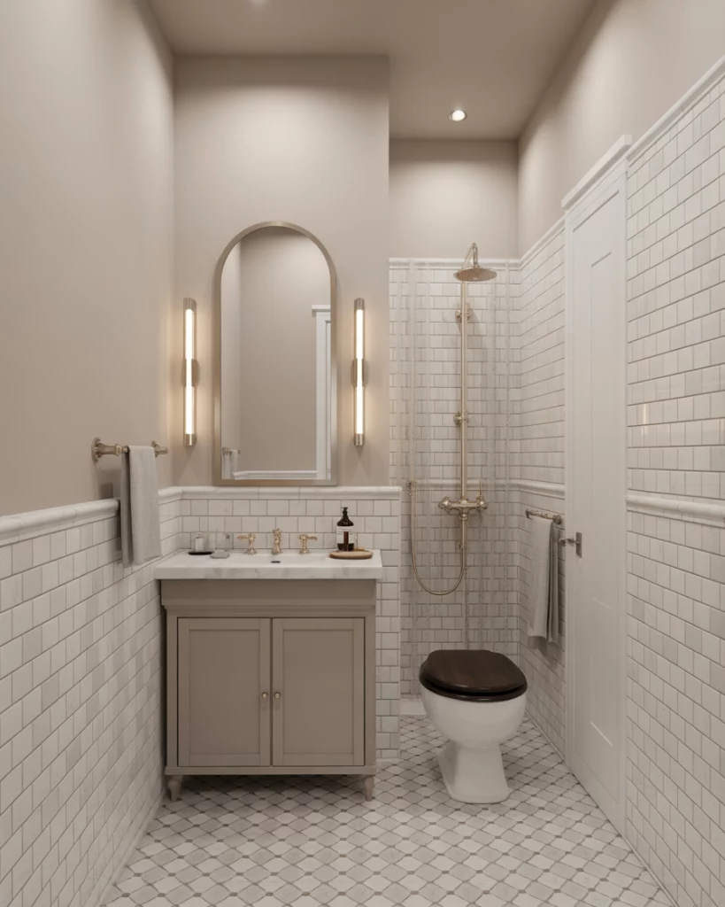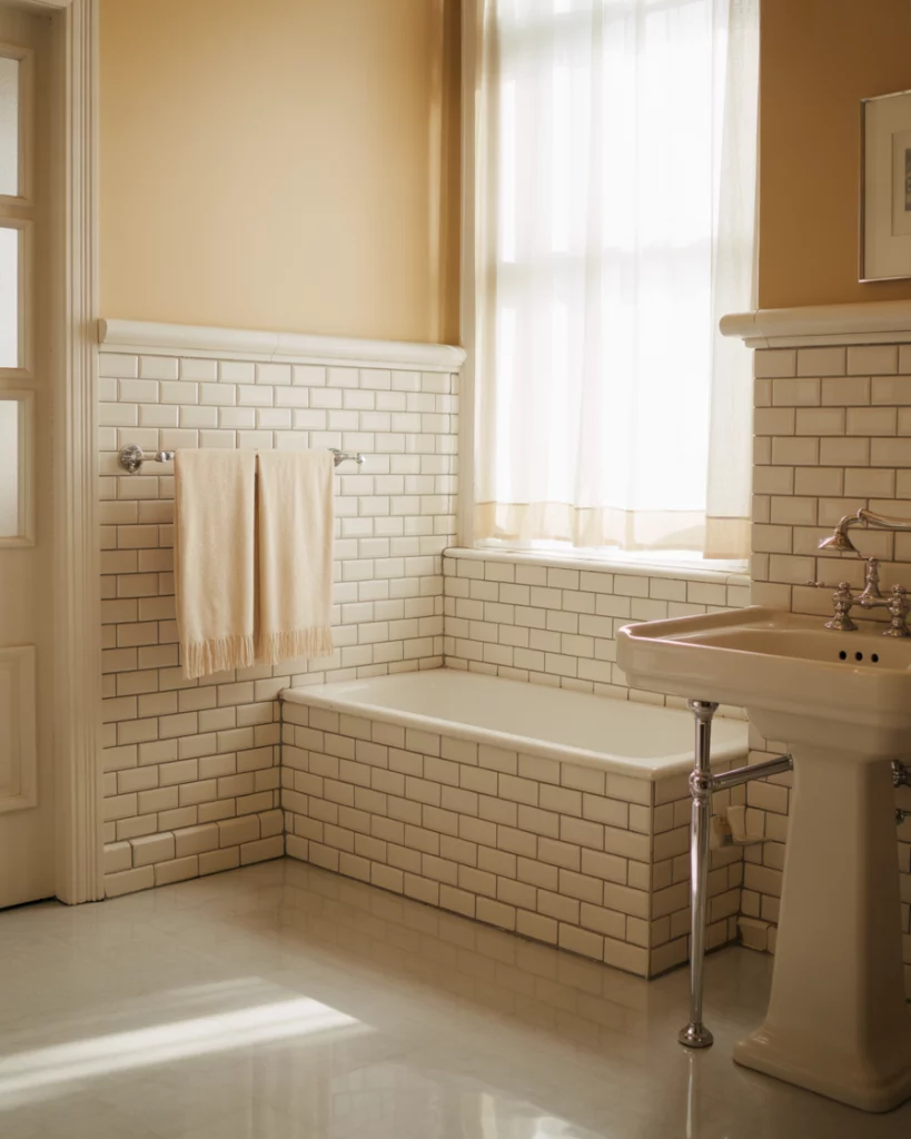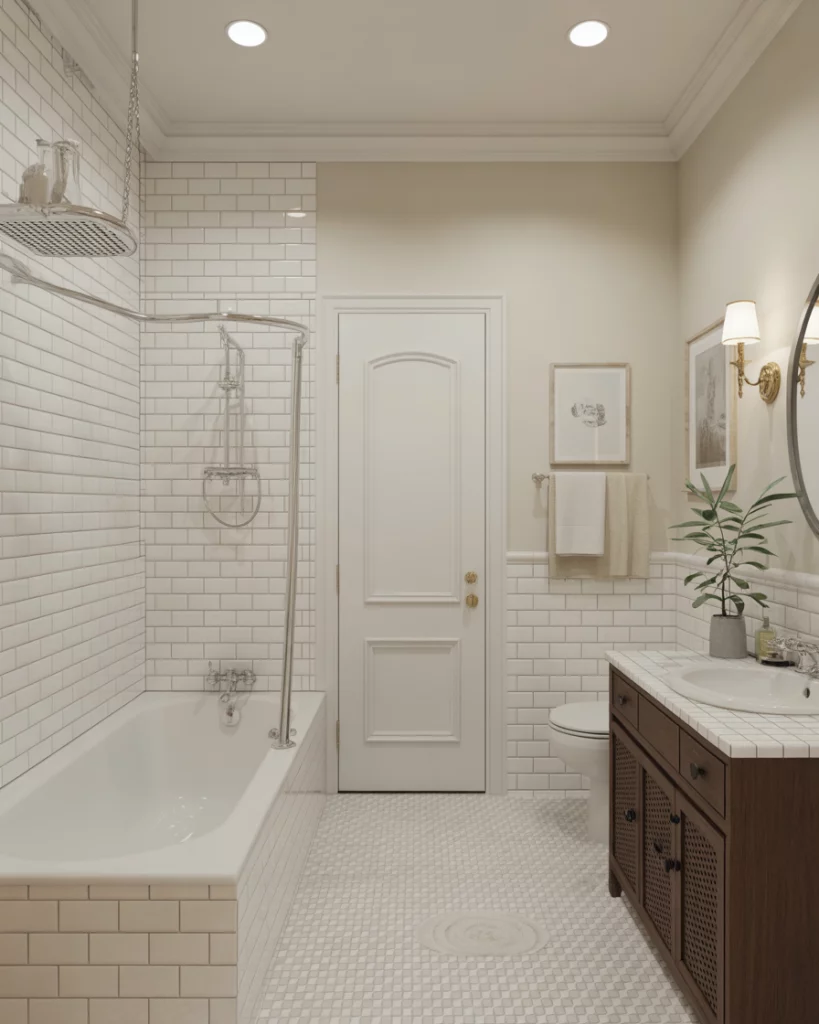 A timeless guest bath features familiar comforts—subway tile, soft neutrals, and traditional hardware. This works beautifully with a walk-in tub layout or a modest full bath conversion. I learned from design writers at House Beautiful that simplicity ages best, especially for resale.