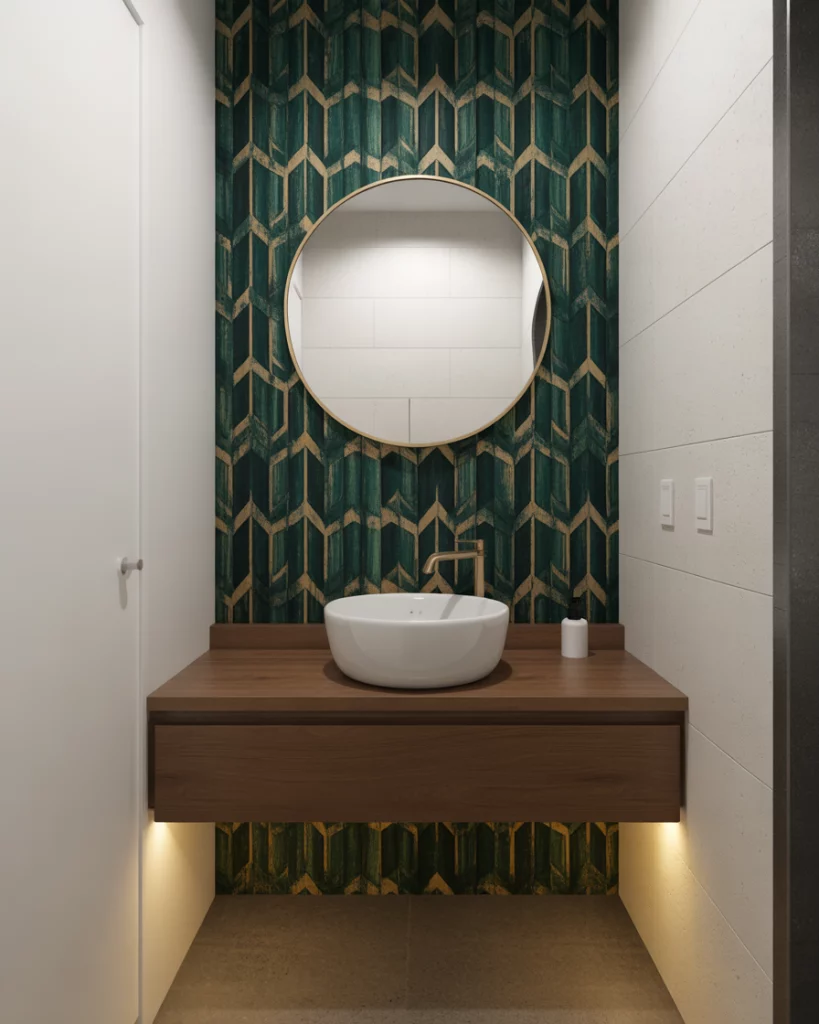 A bold wallpaper feature wall instantly transforms a guest bath, especially in tiny or apartment layouts. From geometric prints to botanical colors, the right pattern adds story without clutter. I’ve always loved how wallpaper makes small spaces feel intentional and stylish.
