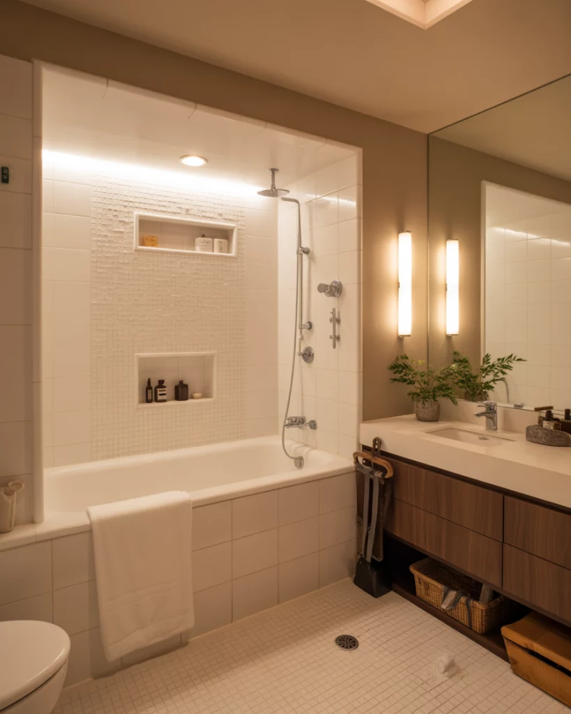 A wet tub layout instantly elevates guest comfort, especially when paired with warm neutral tones and simple decor. Whether it’s a soaking tub or a compact shower-tub combo, the space becomes a relaxing pause for visitors. One friend added a wooden bath tray, and guests still rave about it.