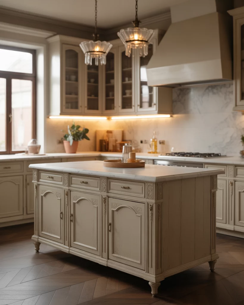 An island inspired by an antique furniture piece adds charm and history to the room. Turned legs, aged finishes, and subtle carvings contrast beautifully with modern surroundings. Layering in light decor pieces keeps it from feeling overly formal while highlighting the craftsmanship. Don’t overload ornate islands with busy accessories. Too many visual layers can feel cluttered; keep styling minimal so the craftsmanship stands on its own.