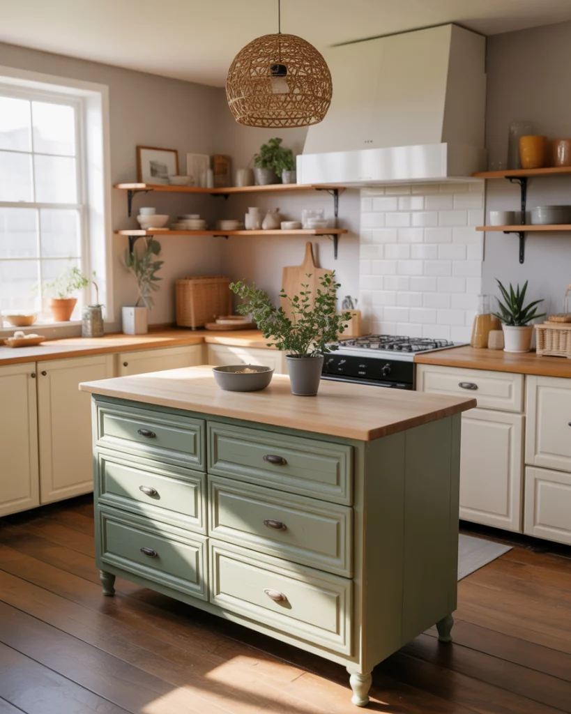 A clever, easy DIY transformation using a repurposed dresser or console creates a one-of-a-kind island. The character of existing furniture paired with fresh paint brings charm to small kitchens where creativity solves tight layouts. Add casters or a top overhang for added function. Many repurposed islands start under $100, especially when sourced from thrift shops or Facebook Marketplace—an accessible way to personalize your kitchen.