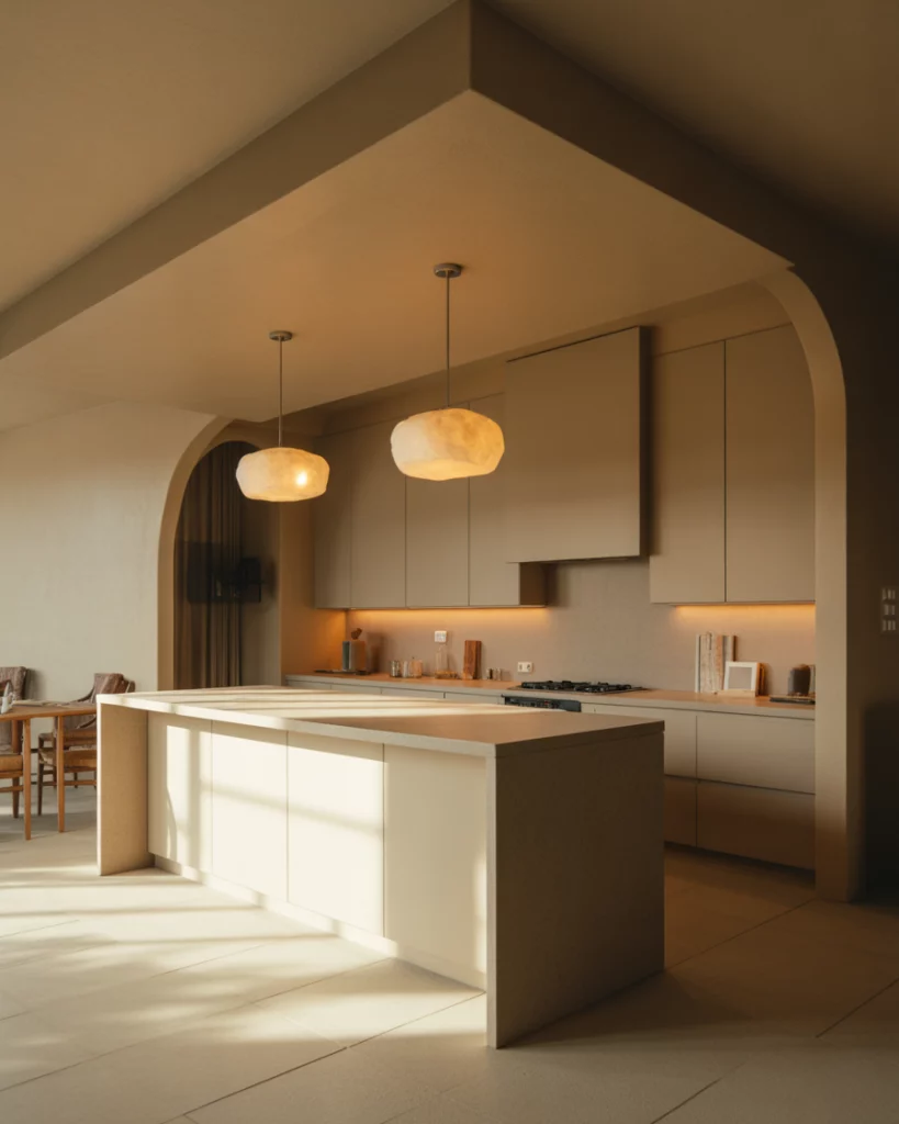 A curved island brings gentler movement to the kitchen while adding a sculptural touch that feels current. It’s especially appealing when paired with warm materials like white oak or matte black fixtures. The rounded edges open up circulation, making it a natural choice for lively households or anyone craving a more organic layout. Designers note that curved islands work best when you maintain generous clearance around the arc so the shape feels intentional, not cramped. It also pairs nicely with layered lighting to emphasize the silhouette without overwhelming a modest room.