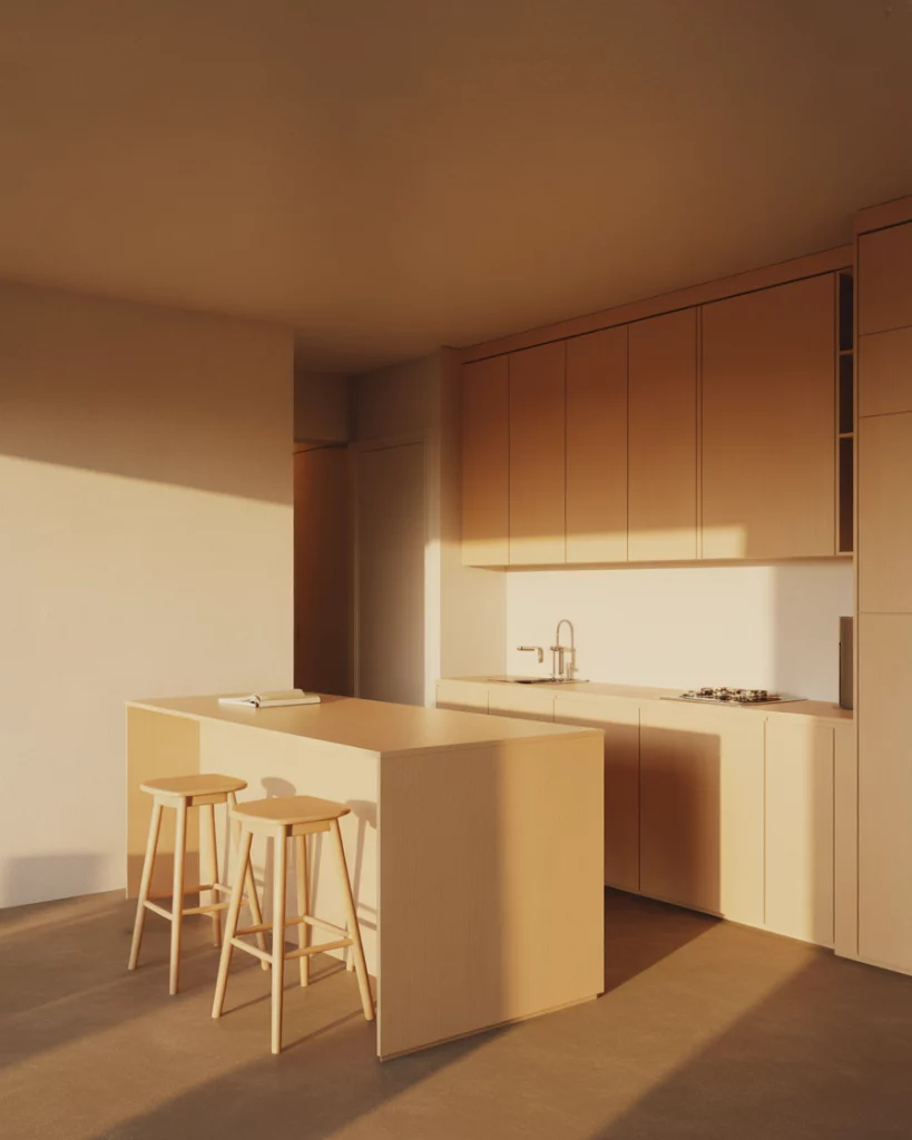 A small island designed for efficiency and compactness suits studio layouts and provides room for more kitchen functions. Blends in with other light furniture with subtle white oak tones and decor. Provides additional prep space and a casual dining area. It’s best to avoid chunky bases and dark tones in order to avoid closing the space. Narrow proportions in light wood keep the studio open and avoid visual shrinkage.