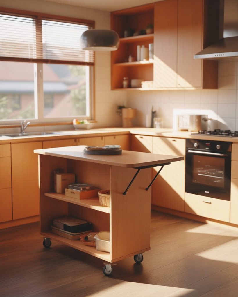 For ultra-compact kitchens, a pull-out island offers workspace that disappears when not in use. It suits tiny apartments or studios where every inch counts. Paired with smooth runners and simple small-space design, it feels intentional rather than improvised. Look for heavy-duty slides rated for high weight so the extension remains stable even when loaded with cutting boards or appliances.