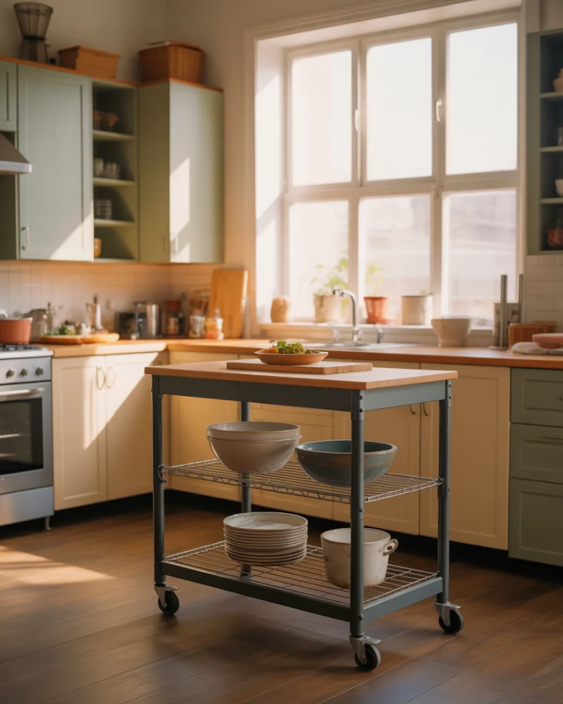 A mobile island adds freedom to rearrange the kitchen depending on the day. Whether you’re prepping dinner or hosting friends, the flexibility is unmatched. Many models—especially Ikea and similar lines—feature smart portable shelves and surfaces that feel surprisingly sturdy. People often shift mobile islands closer to the cooktop on busy weeknights and then wheel them aside during gatherings to free up floor space—proof that versatility really does earn its keep.