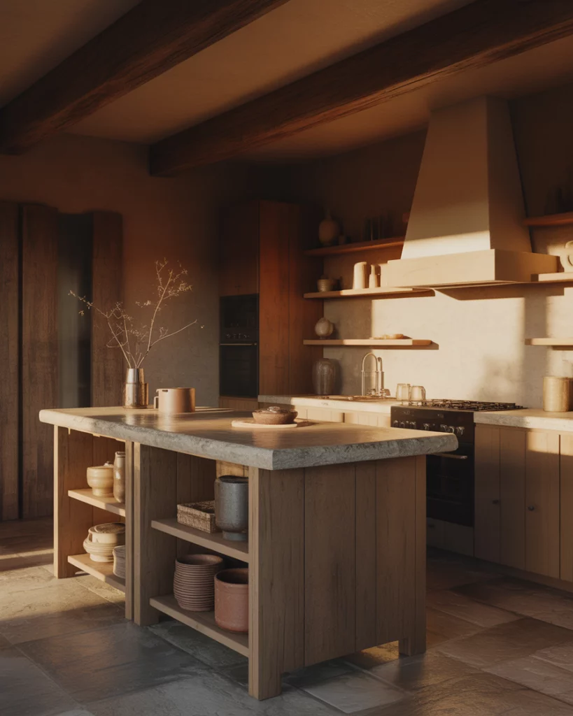 A rustic island grounded in natural wood tones softens modern kitchens and brings back a handcrafted feel. Slight distressing adds character, while practical additions like hooks or low shelves make everyday tools easy to grab. It pairs beautifully with a farmhouse-leaning palette. Don’t overdo the patina—too much distressing looks contrived. Balance the rustic texture with clean counters or polished hardware to maintain harmony.