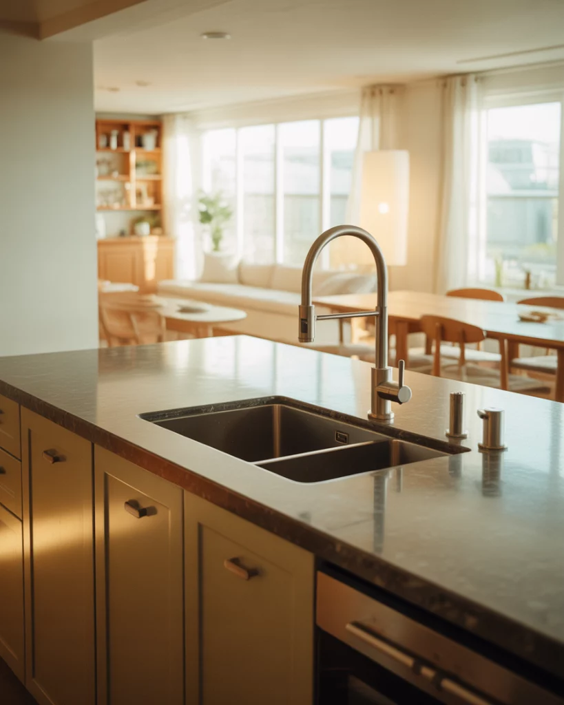 A modular island system adapts as your needs change, making it ideal for evolving households. Components can shift to create extra seating or accommodate new storage needs. Clean, modern shapes keep the look cohesive even when rearranged. As more people shift between remote work and family routines, flexible kitchen layouts let the space serve as an office, homework station, and cooking zone without a remodel.