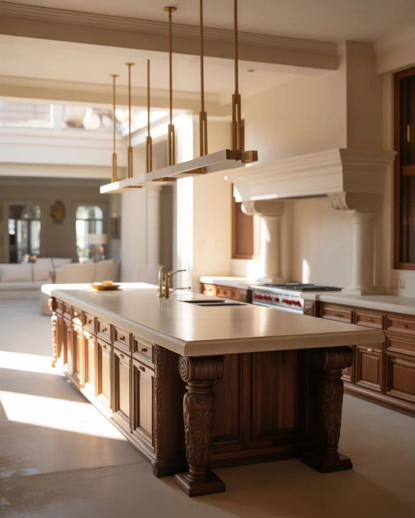A grand island supported by decorative columns instantly becomes the focal point of a generous kitchen. The structure creates subtle zones for prepping, serving, or displaying decor. Its scale pairs well with lighting that stretches the length of the counter, reinforcing the room’s architecture. Homes with open family rooms—common in new U.S. builds—benefit from a statement island that anchors the entire living space, helping maintain definition without adding walls.