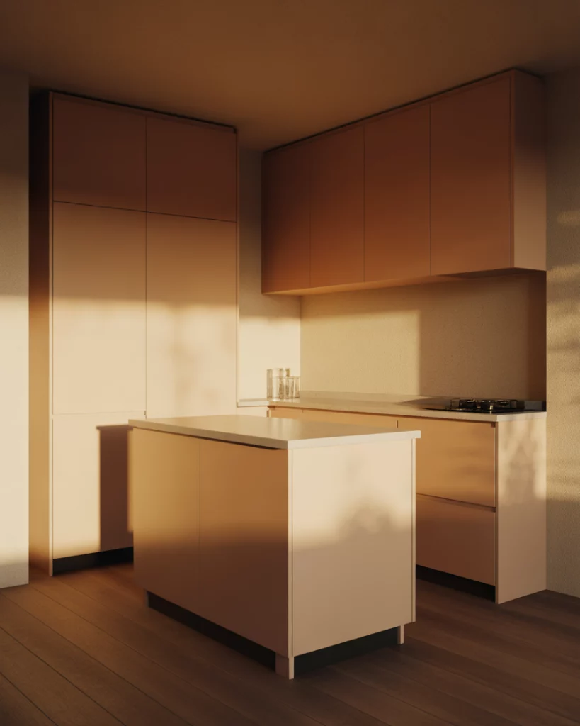 A small island designed for efficiency and compactness suits studio layouts and provides room for more kitchen functions. Blends in with other light furniture with subtle white oak tones and decor. Provides additional prep space and a casual dining area. It’s best to avoid chunky bases and dark tones in order to avoid closing the space. Narrow proportions in light wood keep the studio open and avoid visual shrinkage.
