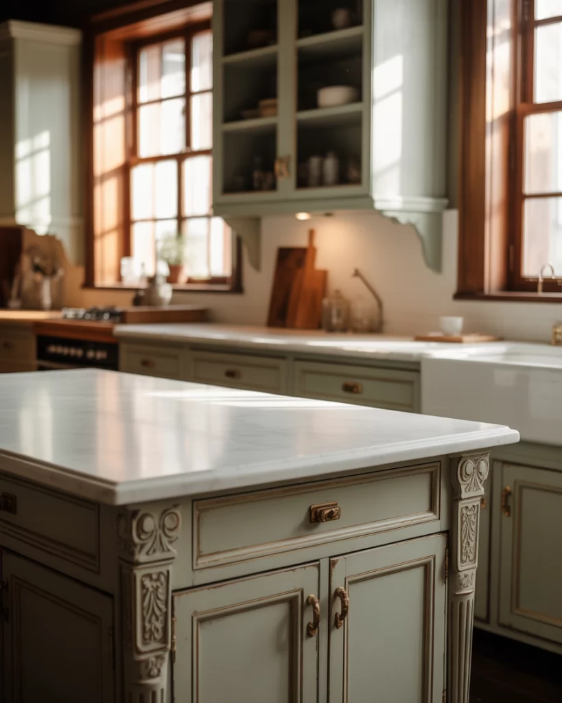An island inspired by an antique furniture piece adds charm and history to the room. Turned legs, aged finishes, and subtle carvings contrast beautifully with modern surroundings. Layering in light decor pieces keeps it from feeling overly formal while highlighting the craftsmanship. Don’t overload ornate islands with busy accessories. Too many visual layers can feel cluttered; keep styling minimal so the craftsmanship stands on its own.