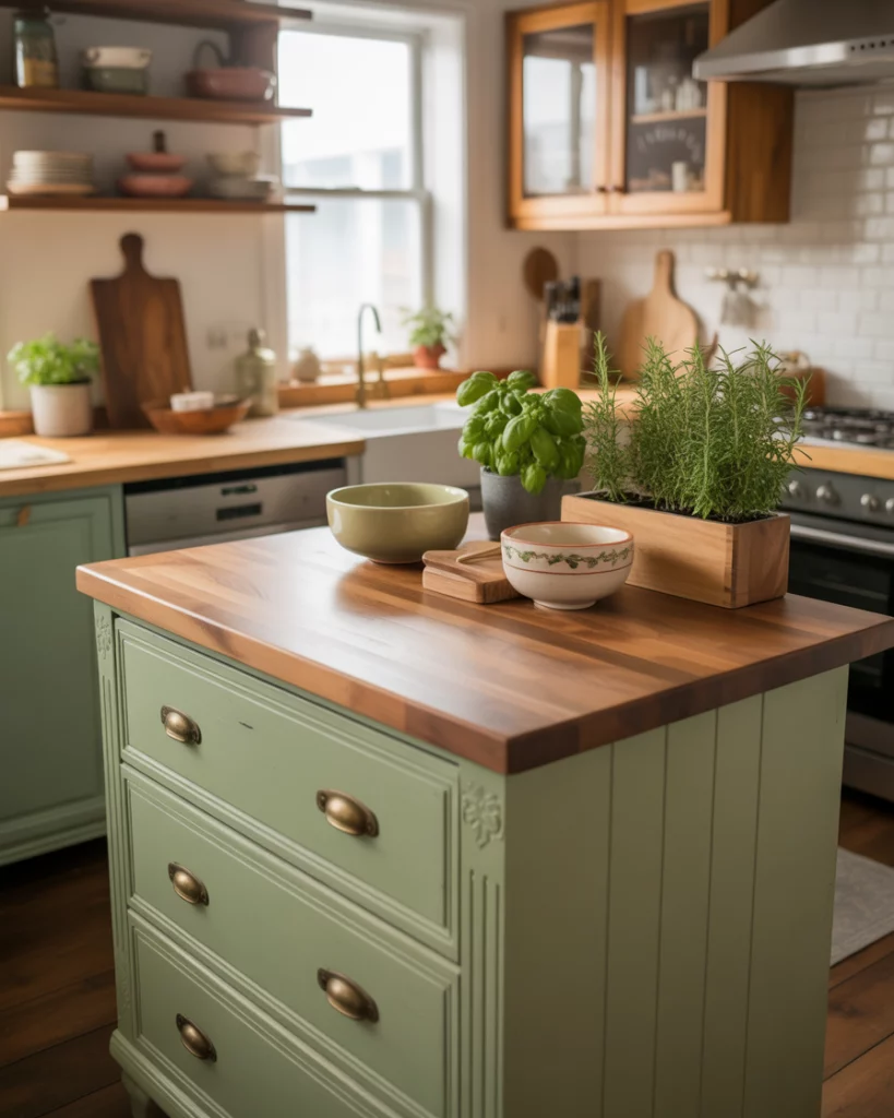 A clever, easy DIY transformation using a repurposed dresser or console creates a one-of-a-kind island. The character of existing furniture paired with fresh paint brings charm to small kitchens where creativity solves tight layouts. Add casters or a top overhang for added function. Many repurposed islands start under $100, especially when sourced from thrift shops or Facebook Marketplace—an accessible way to personalize your kitchen.