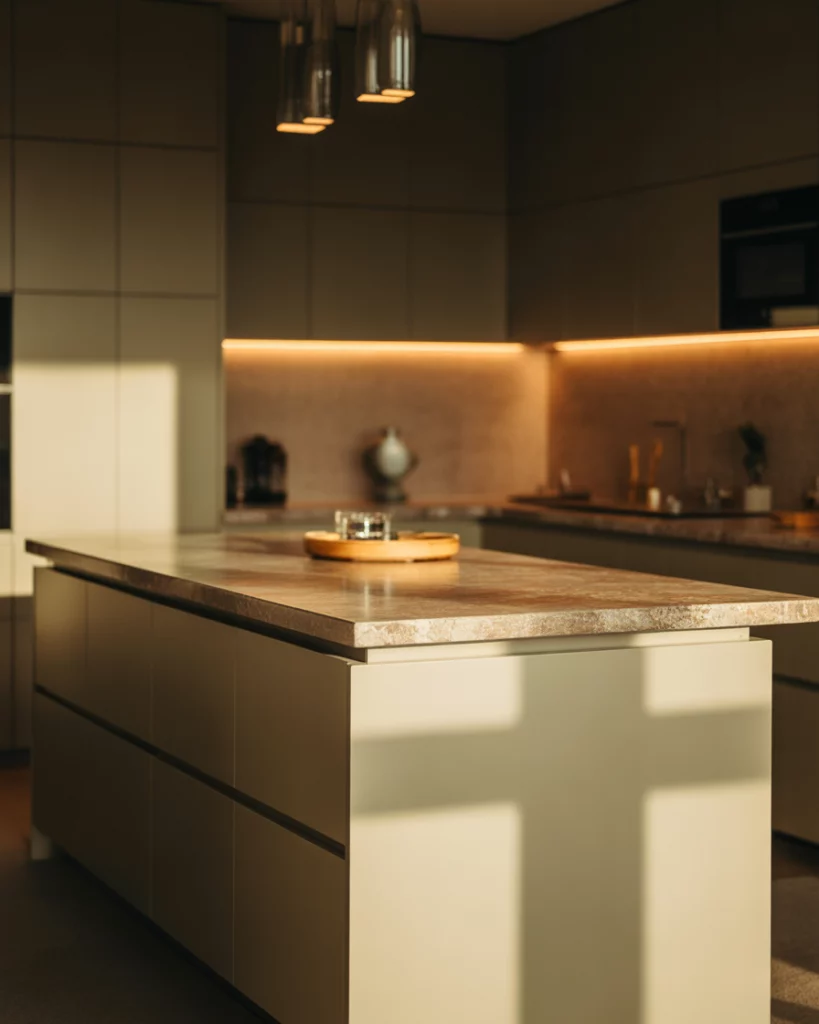Lighting can transform an island from functional to atmospheric. Mixing pendants with subtle LED strips highlights the counter’s texture and gives extra dimension, especially in modern interiors. This approach works beautifully with dark decor accents that absorb and reflect light differently. Layered lighting reduces glare and creates depth, making the kitchen feel more expensive without major construction work.