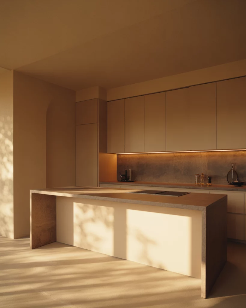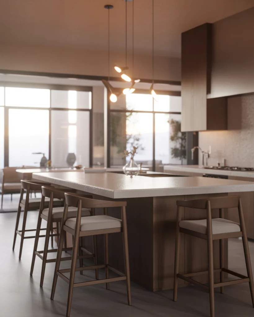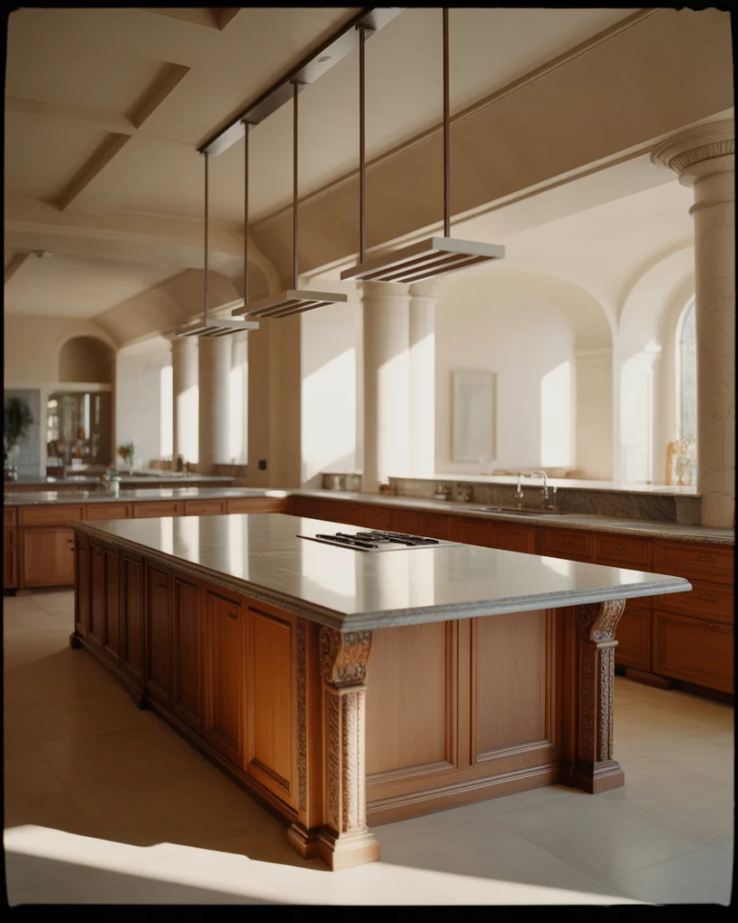 A grand island supported by decorative columns instantly becomes the focal point of a generous kitchen. The structure creates subtle zones for prepping, serving, or displaying decor. Its scale pairs well with lighting that stretches the length of the counter, reinforcing the room’s architecture. Homes with open family rooms—common in new U.S. builds—benefit from a statement island that anchors the entire living space, helping maintain definition without adding walls.