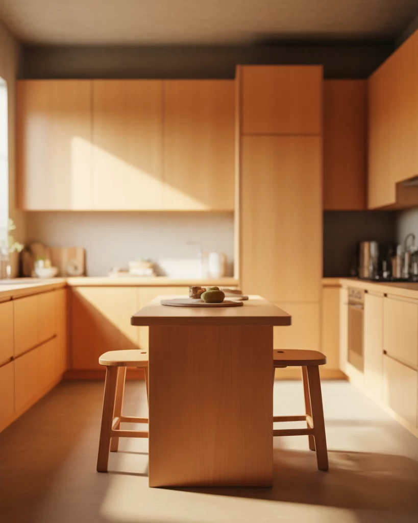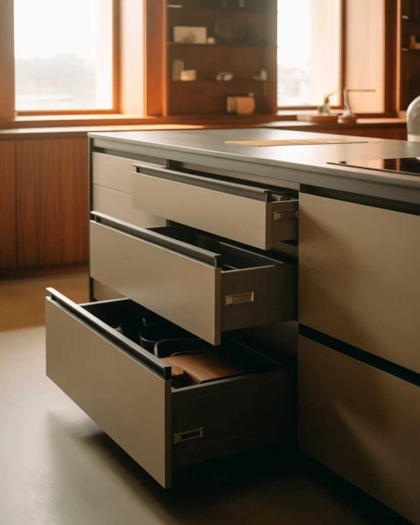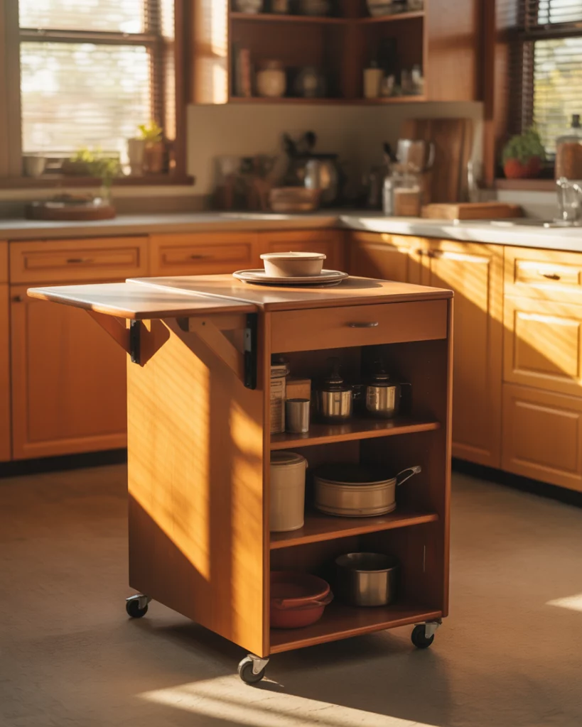 For ultra-compact kitchens, a pull-out island offers workspace that disappears when not in use. It suits tiny apartments or studios where every inch counts. Paired with smooth runners and simple small-space design, it feels intentional rather than improvised. Look for heavy-duty slides rated for high weight so the extension remains stable even when loaded with cutting boards or appliances.