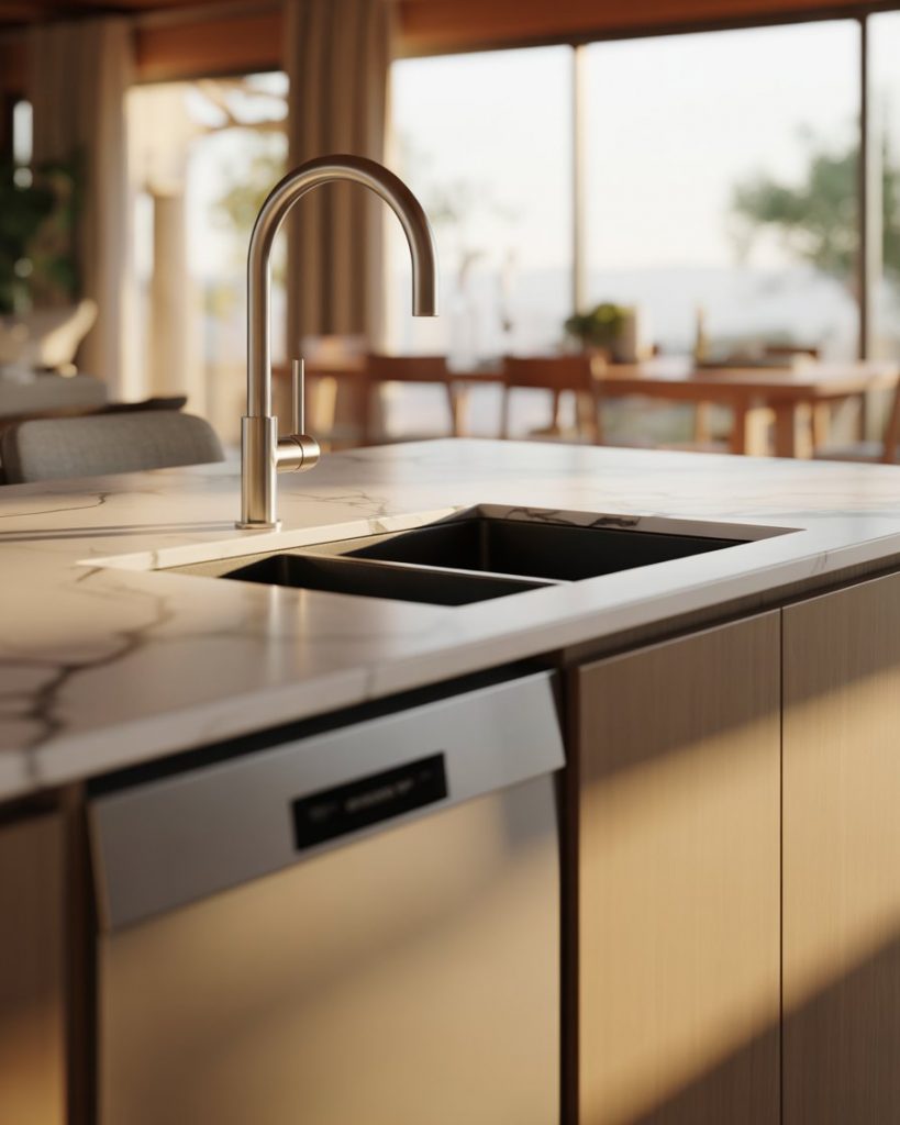 Placing a sink in the island centralizes cleanup, keeps conversations flowing, and fits effortlessly into open-concept layouts. It’s especially effective in spaces that juggle cooking and entertaining at once. A crisp white counter or contrasting tone can make the feature feel intentional. If you’re adding a sink, consider hiding the drying rack inside a drawer or pull-out tray. This keeps the visual clutter low while maintaining the everyday functionality you rely on.