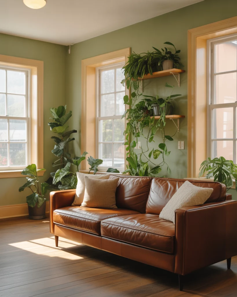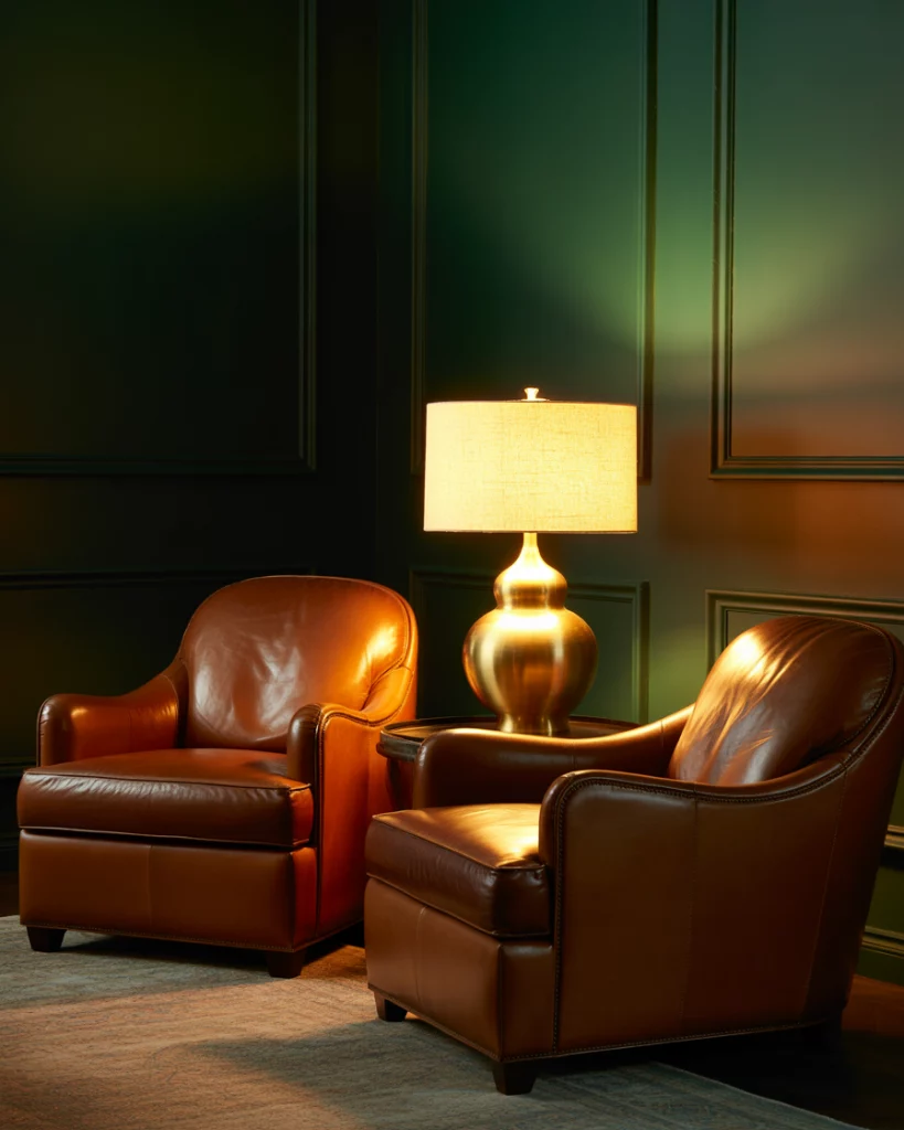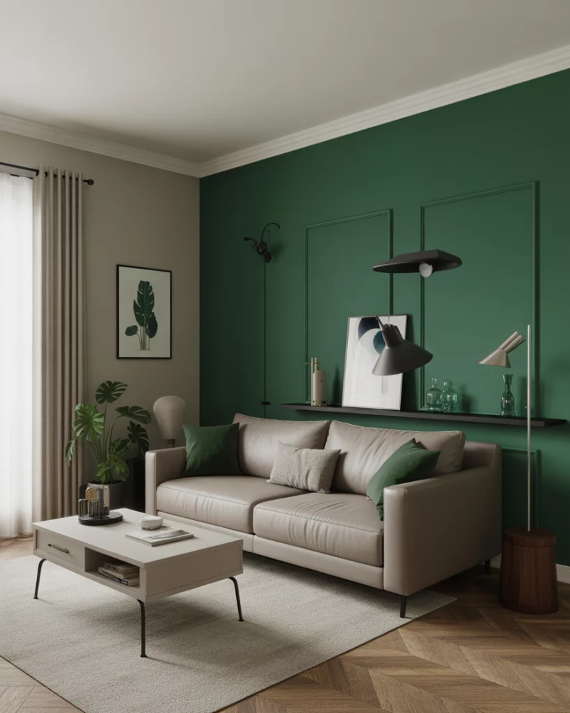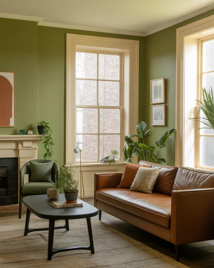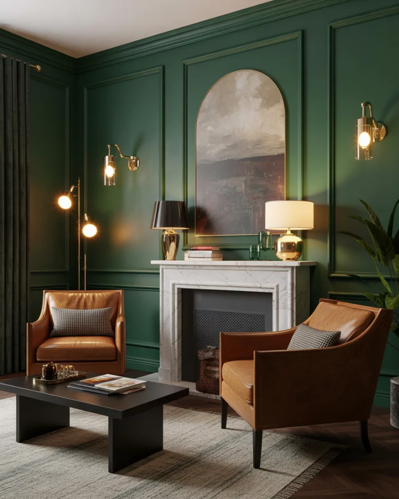 A luxurious combination for 2026: deep forest green walls accented with brass lamps and leather chairs. This palette feels moody, dramatic, and very good for creating an intimate conversation zone. Designers note that green is evolving into a new neutral, pairing beautifully with wood, brass, or black trim. This scheme idea fits perfectly in a library-style living room or a cozy urban loft.