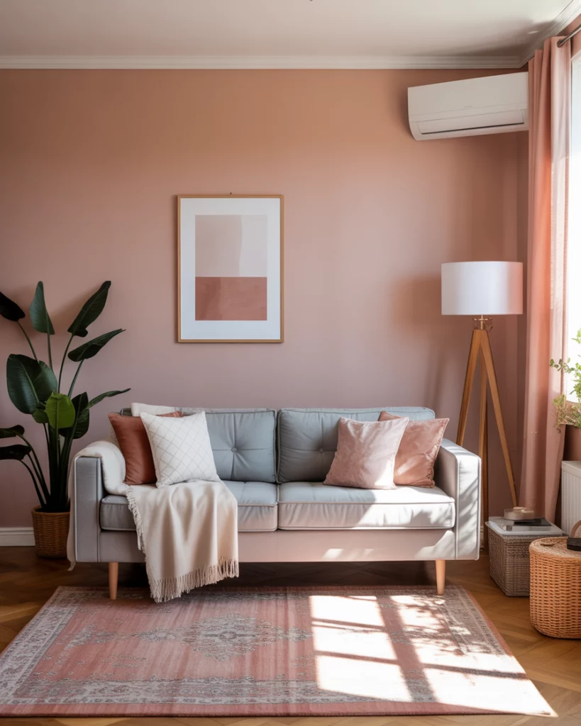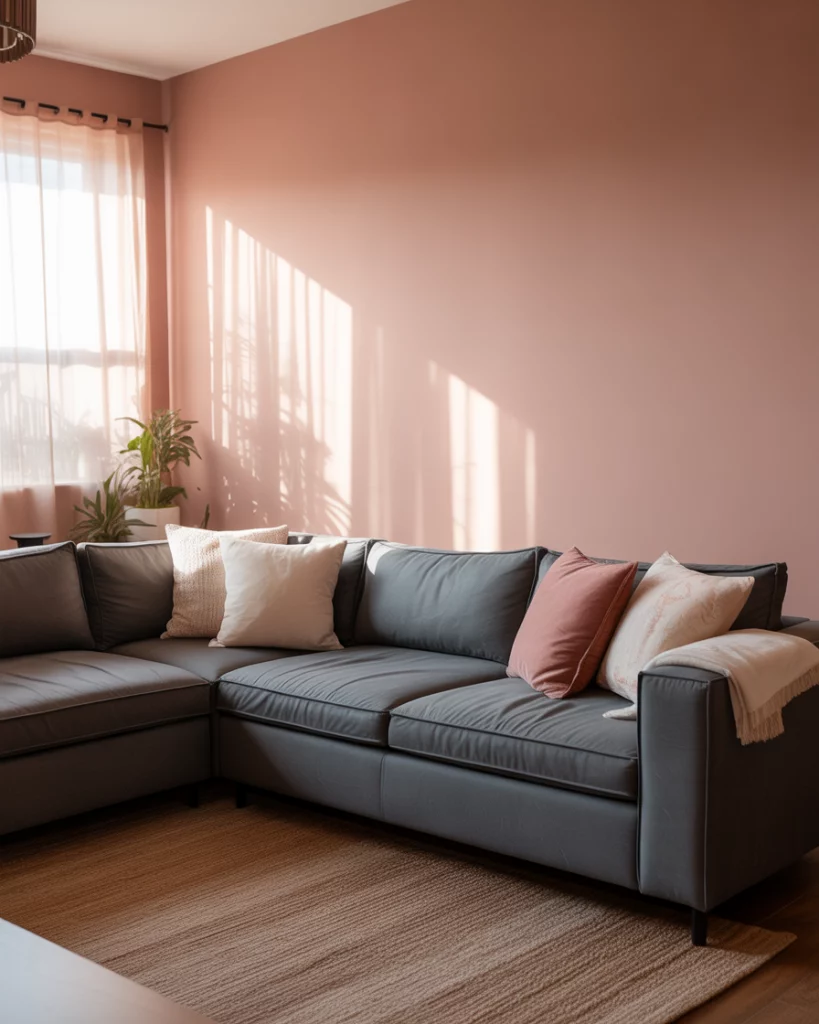 For those working around a grey couch, one of the top ideas for paint in 2026 is using a warm blush or dusty rose wall. This combination softens the industrial tone of grey and adds warmth without feeling overly feminine. Interior stylists at Benjamin Moore recommend mixing muted pinks with textured throws or wool rugs for a relaxed, cozy aesthetic. The palette feels sophisticated, fresh, and surprisingly versatile.